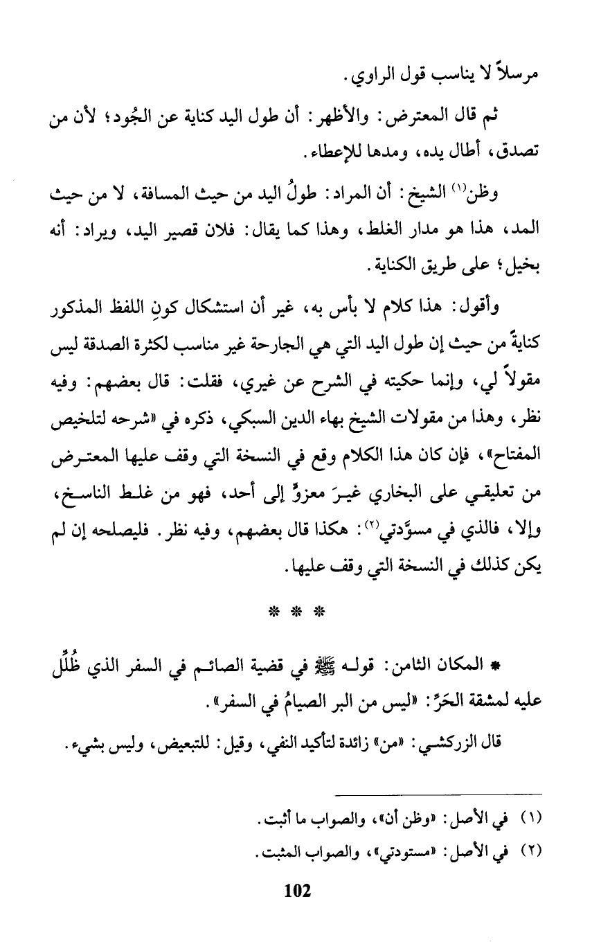 وأقول: هذا كلام لا بأس به، غير أن استشكال كونِ اللفظ المذكور كنايةً من حيث إن طول اليد التي هي الجارحة غير مناسب لكثرة الصدقة ليس مقولًا لي، وإنما حكيته في الشرح عن غيري، فقلت: قال بعضهم: وفيه نظر، وهذا من مقولات الشيخ بهاء الدين السبكي، ذكره في "شرحه لتلخيص المفتاح"، فإن كان هذا الكلام وقع في النسخة التي وقف عليها المعترض من تعليقي على البخاري غيرَ معزوٍّ إلى أحد، فهو من غلط الناسخ، وإلا، فالذي في مسوَّدتي (¬2): هكذا قال بعضهم، وفيه نظر. فليصلحه إن لم يكن كذلك في النسخة التي وقف عليها.