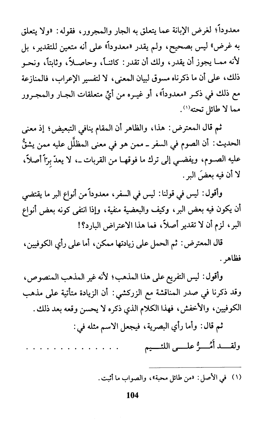 وأقول: ليس في قولنا: ليس في السفر، معدودًا من أنواع البر ما يقتضي أن يكون فيه بعض البر، وكيف والبعضية منفية، وإذا انتفى كونه بعض أنواع البر، لزم أن لا تقدير أصلًا، فما هذا الاعتراض البارد؟!