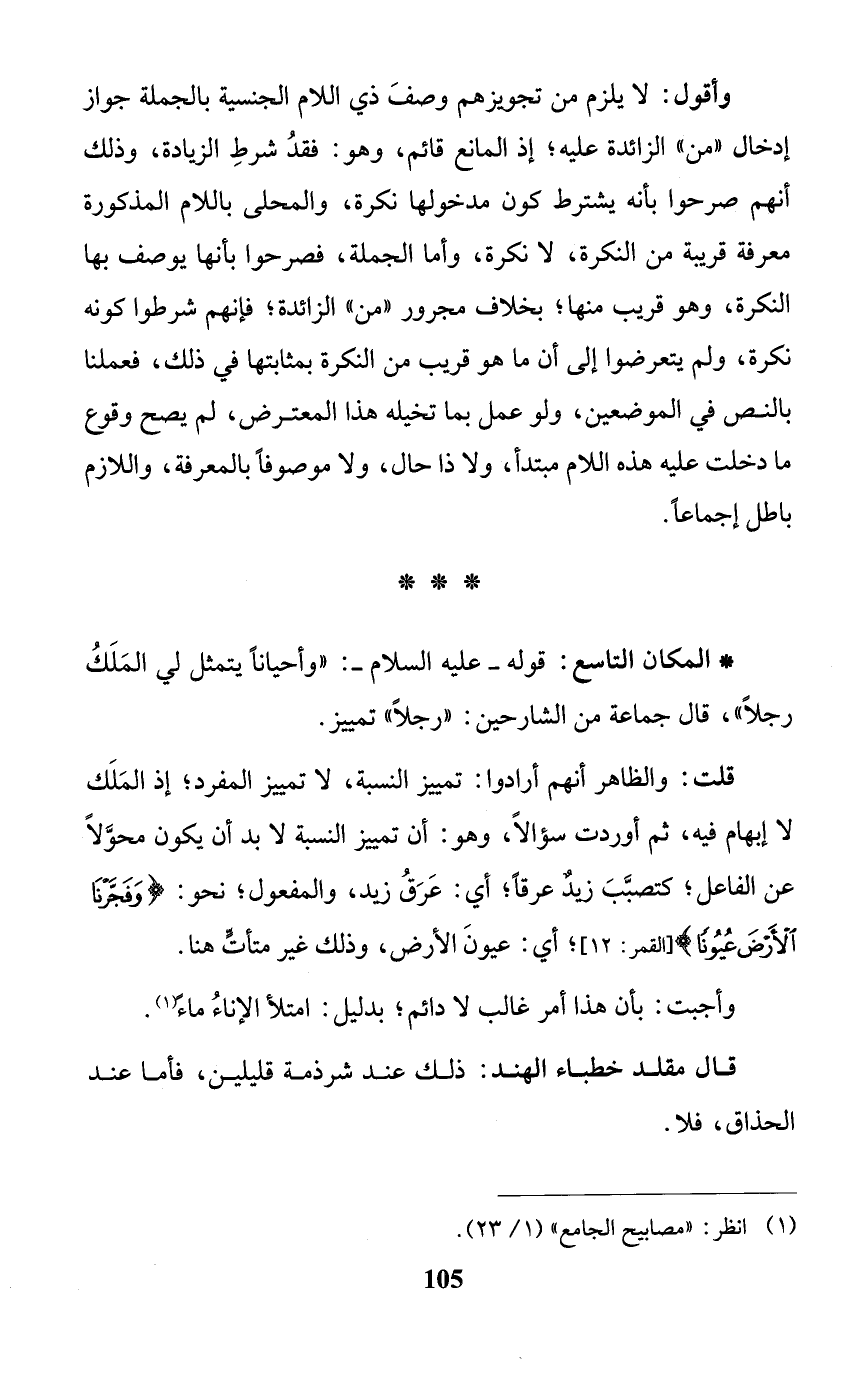 وأقول: لا يلزم من تجويزهم وصفَ ذي اللام الجنسية بالجملة جواز إدخال "من" الزائدة عليه؛ إذ المانع قائم، وهو: فقدُ شرطِ الزيادة، وذلك أنهم صرحوا بأنه يشترط كون مدخولها نكرة، والمحلى باللام المذكورة معرفة قريبة من النكرة، لا نكرة، وأما الجملة، فصرحوا بأنها يوصف بها النكرة، وهو قريب منها؛ بخلاف مجرور "من" الزائدة؛ فإنهم شرطوا كونه نكرة، ولم يتعرضوا إلى أن ما هو قريب من النكرة بمثابتها في ذلك، فعملنا بالنص في الموضعين، ولو عمل بما تخيله هذا المعترض، لم يصح وقوع ما دخلت عليه هذه اللام مبتدأ، ولا ذا حال، ولا موصوفًا بالمعرفة، واللازم باطل إجماعًا.