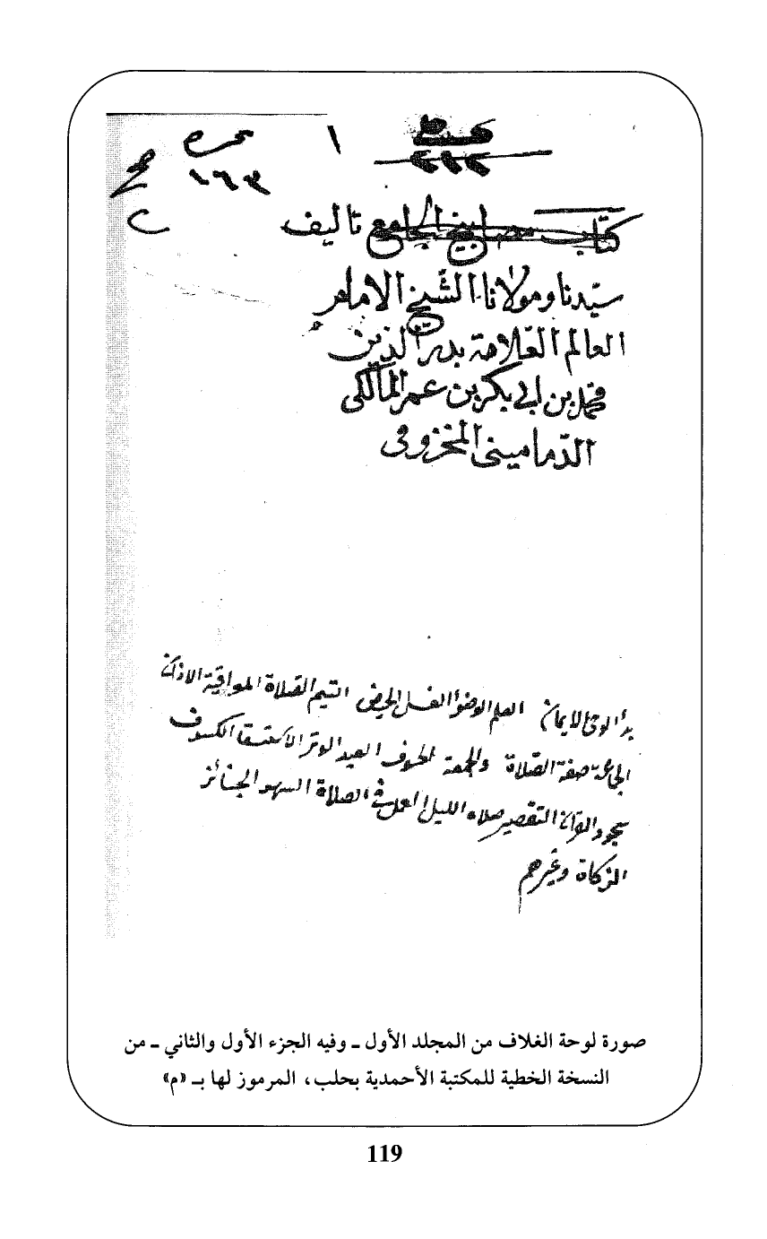 صورة لوحة الغلاف من المجلد الأول -وفيه الجزء الأول والثاني- من النسخة الخطية للمكتبة الأحمدية بحلب، المرموز لها بـ (م)