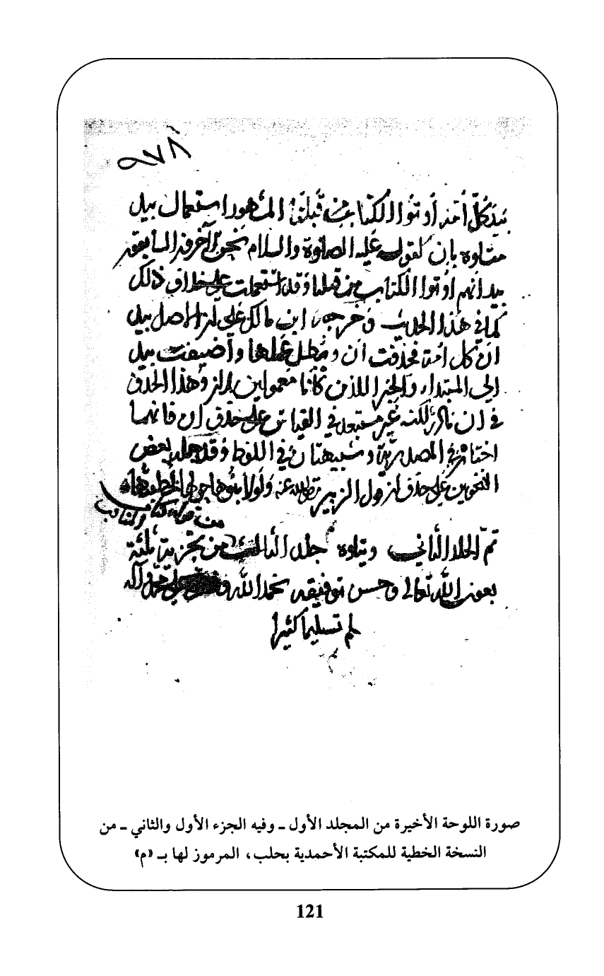 صورة اللوحة الأخيرة من المجلد الأول -وفيه الجزء الأول والثاني- من النسخة الخطية للمكتبة الأحمدية بحلب، المرموز لها بـ "م"