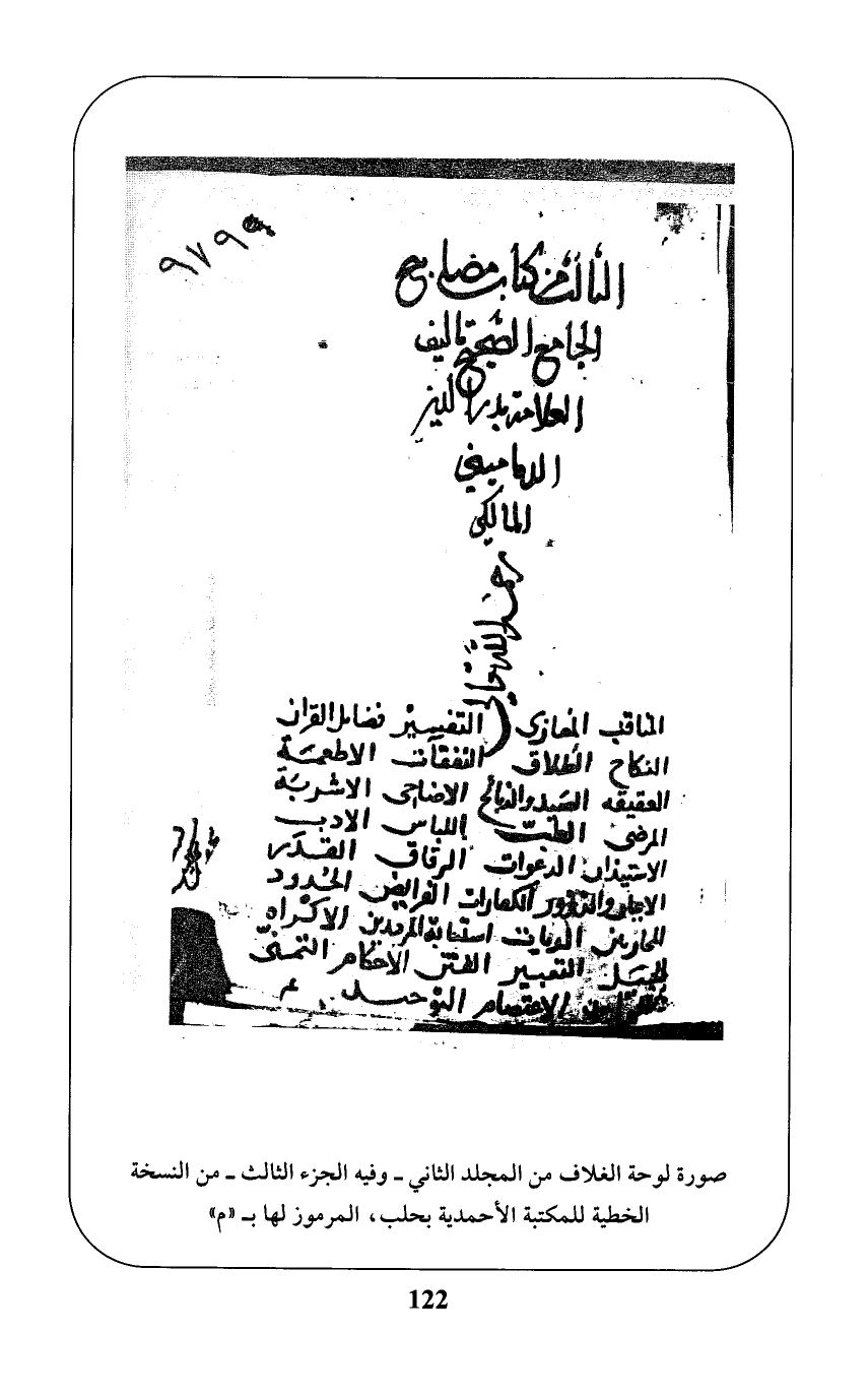 صورة لوحة الغلاف من المجلد الثاني -وفيه الجزء الثالث- من النسخة الخطية للمكتبة الأحمدية بحلب، المرموز لها بـ "م"