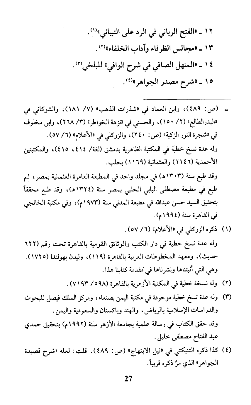 = (ص: 489)، وابن العماد في "شذرات الذهب" (7/ 181)، والشوكاني في "البدر الطالع" (2/ 150)، والحسني في "نزهة الخواطر" (3/ 268)، وابن مخلوف في "شجرة النور الزكية" (ص: 240)، والزركلي في "الأعلام" (6/ 57).