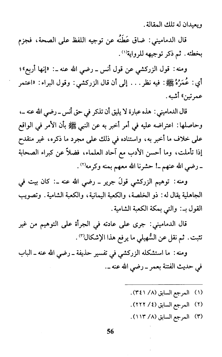 ومنه: قول الزركشي عن قول أنس - رضي الله عنه -: "إنها أربع"؛ أي: عُمَرُهُ - صلى الله عليه وسلم -: فيه نظر ... إلى أن قال الزركشي: وقول البراء: "اعتمر عمرتين" أشبه.