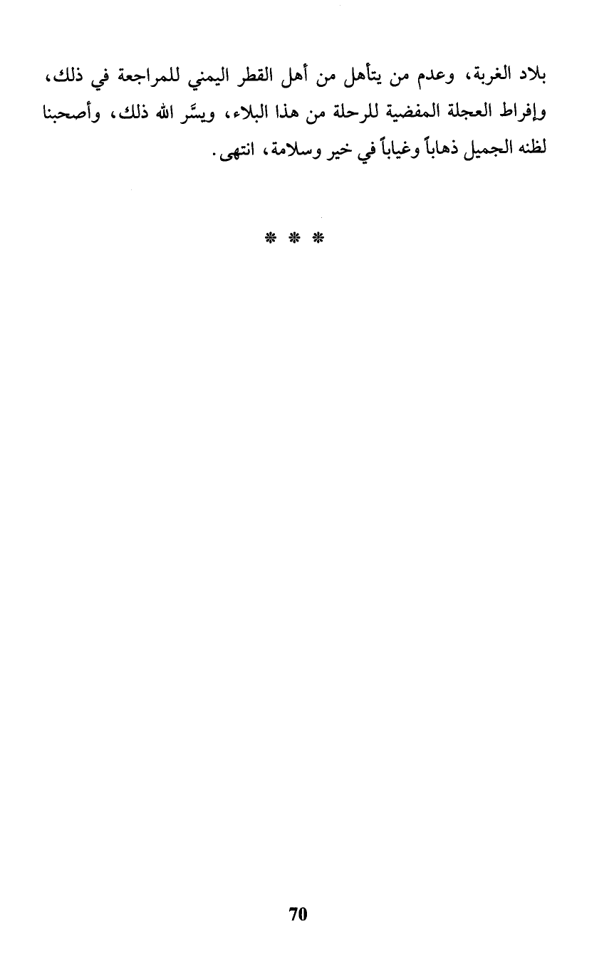 بلاد الغربة، وعدم من يتأهل من أهل القطر اليمني للمراجعة في ذلك، وإفراط العجلة المفضية للرحلة من هذا البلاء، ويسَّر الله ذلك، وأصحبنا لظنه الجميل ذهابًا وغيابًا في خير وسلامة، انتهى.