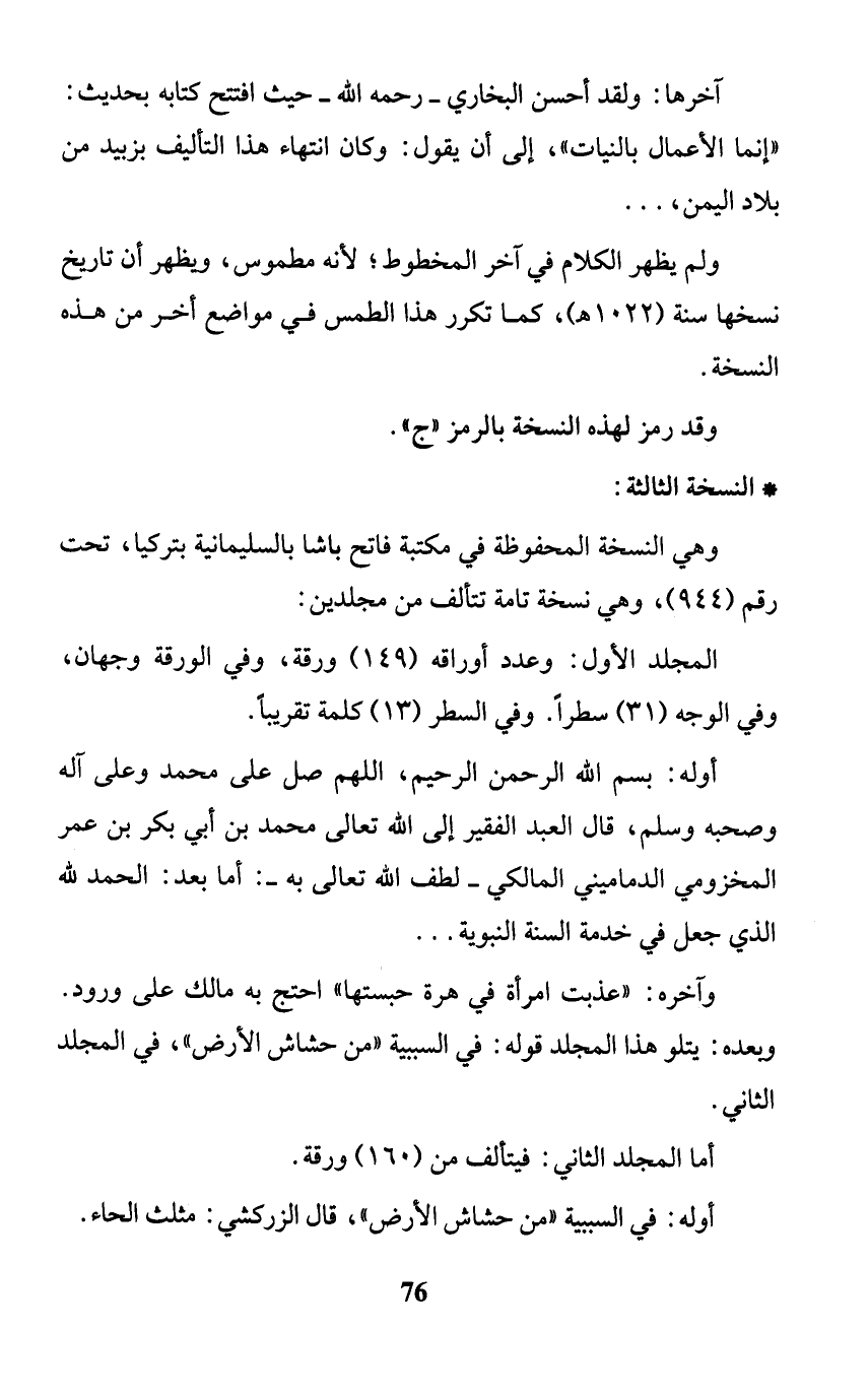 آخرها: ولقد أحسن البخاري - رحمه الله - حيث افتتح كتابه بحديث: "إنما الأعمال بالنيات"، إلى أن يقول: وكان انتهاء هذا التأليف بزبيد من بلاد اليمن، ...