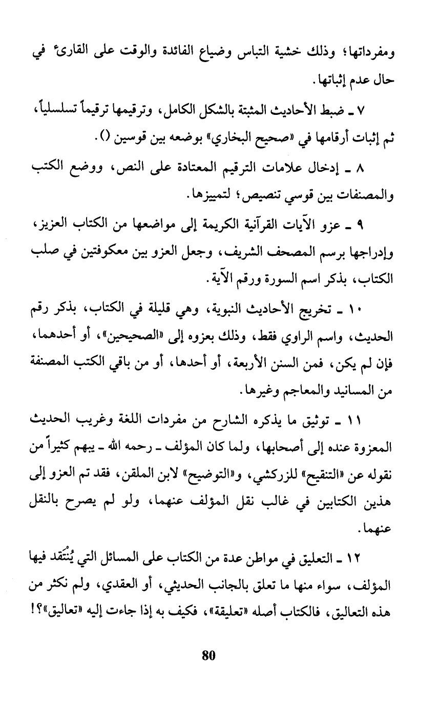 10 - تخريج الأحاديث النبوية، وهي قليلة في الكتاب، بذكر رقم الحديث، واسم الراوي فقط، وذلك بعزوه إلى "الصحيحين"، أو أحدهما، فإن لم يكن، فمن السنن الأربعة، أو أحدها، أو من باقي الكتب المصنفة من المسانيد والمعاجم وغيرها.