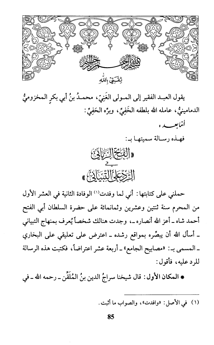 حملني على كتابتها: أني لما وفدت (¬1) الوفادة الثانية في العشر الأول من المحرم سنة ثنتين وعشرين وثمانمائة على حضرة السلطان أبي الفتح أحمد شاه -أعز الله أنصاره-، وجدت هنالك شخصًا يُعرف بمنهاج التبياني -أسأل الله أن يبصِّره بمواقع رشده- اعترض على تعليقي على البخاري -المسمى بـ: "مصابيح الجامع"- أربعة عشر اعتراضًا، فكتبت هذه الرسالة للرد عليه، فأقول: