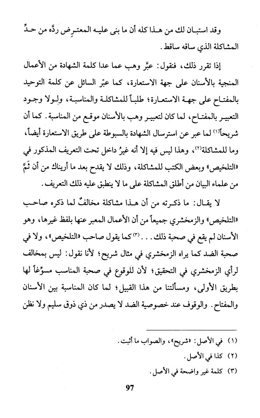 إذا تقرر ذلك، فنقول: عبَّر وهب عما عدا كلمة الشهادة من الأعمال المنجية بالأسنان على جهة الاستعارة، كما عبّر السائل عن كلمة التوحيد بالمفتاح على جهة الاستعارة؛ طلبًا للمشاكلة والمناسبة، ولولا وجود التعبير بالمفتاح، لما كان لتعبير وهب بالأسنان موقع من المناسبة. كما أن شريحًا (¬1) لما عبر عن استرسال الشهادة بالسبوطة على طريق الاستعارة أيضًا، وما للمشاكلة (¬2)، وهذا ليس فيه إلا أنه غيرُ داخل تحت التعريف المذكور في "التلخيص" وبعض الكتب للمشاكلة، وذلك لا يقدح بعد ما أريناك من أن ثَمَّ من علماء البيان من أطلق المشاكلة على ما لا ينطبق عليه ذلك التعريف.