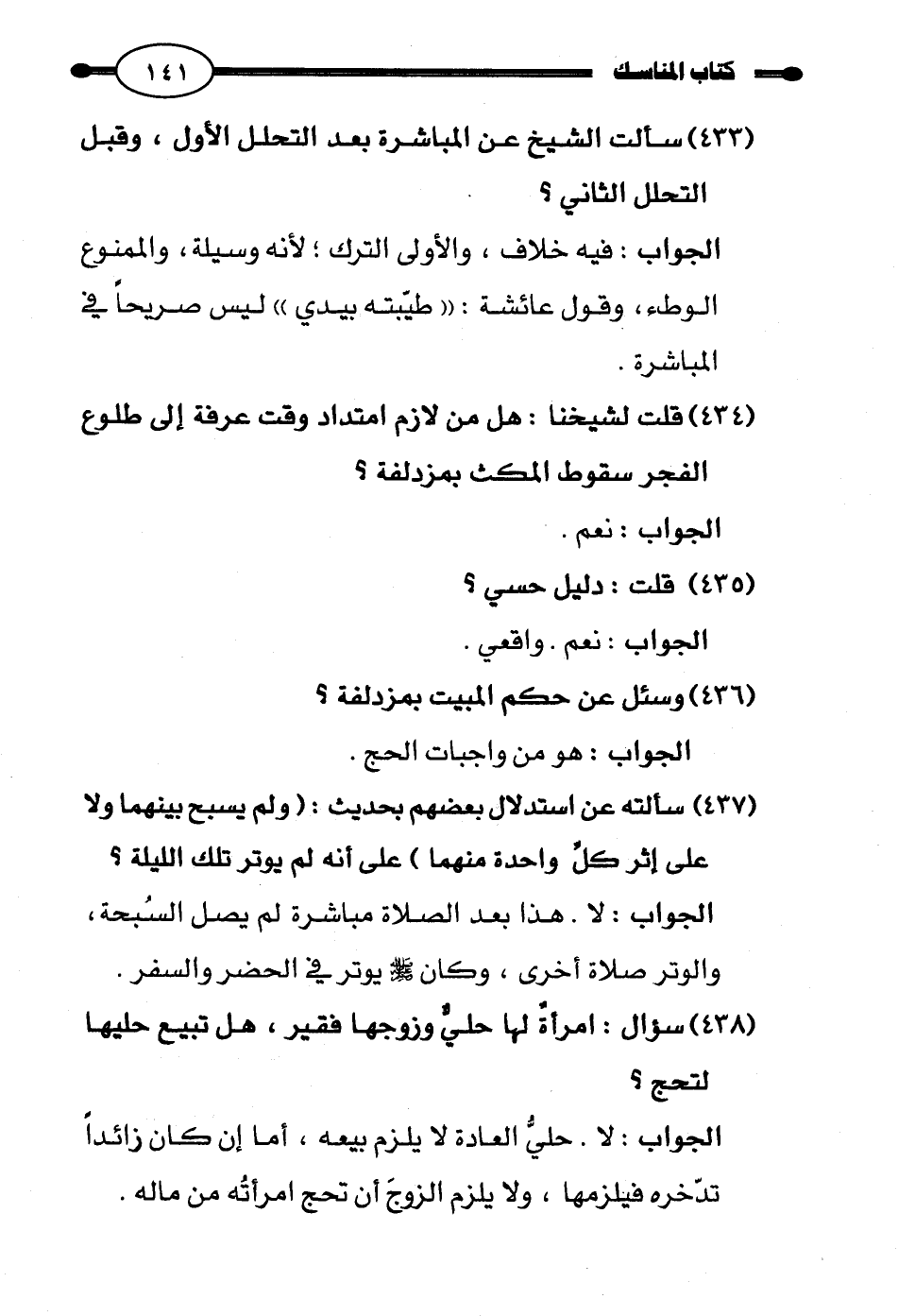 434 - قلت لشيخنا: هل من لازم امتداد وقت عرفة إلى طلوع الفجر سقوط المكث بمزدلفة؟