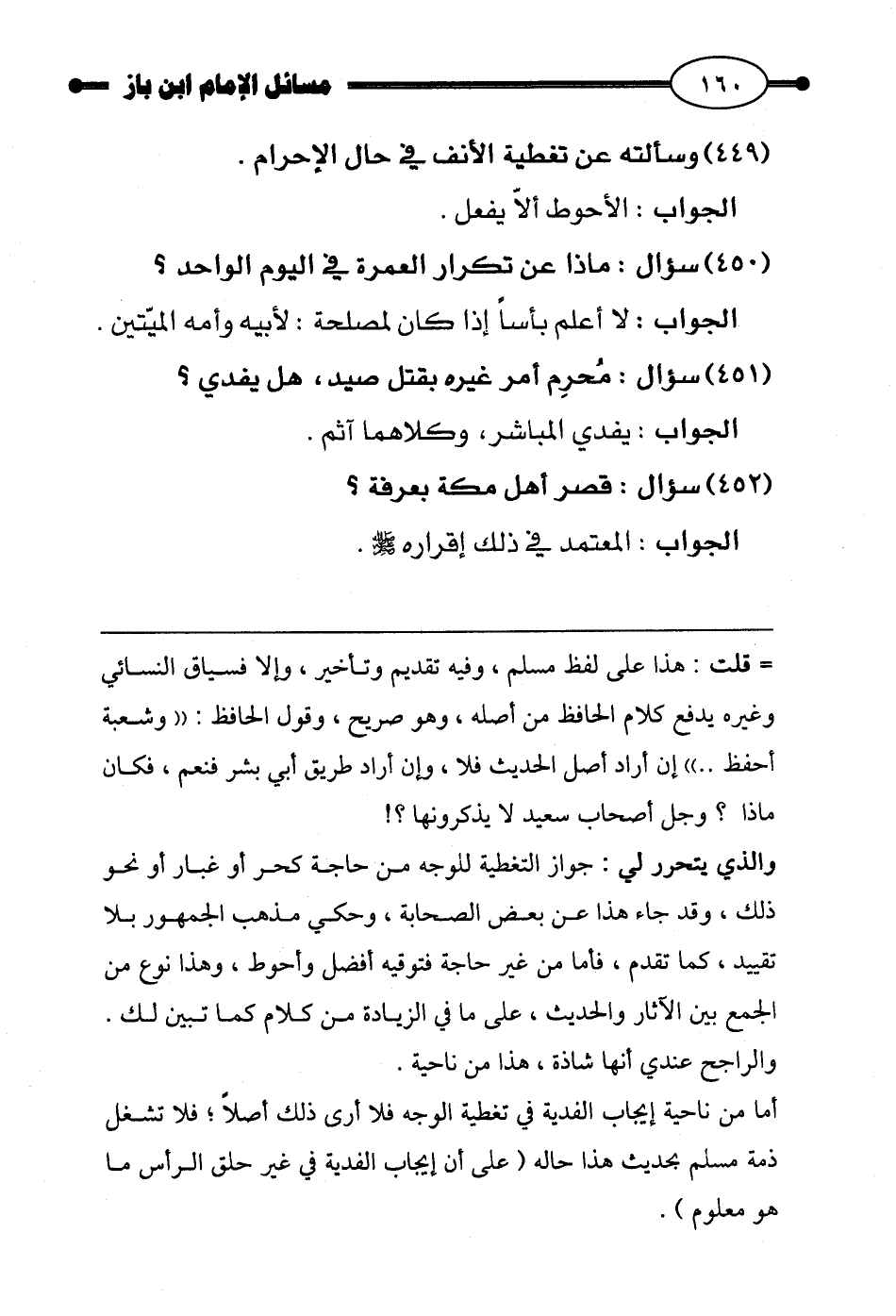 449 - وسألته عن تغطية الأنف في حال الإحرام؟