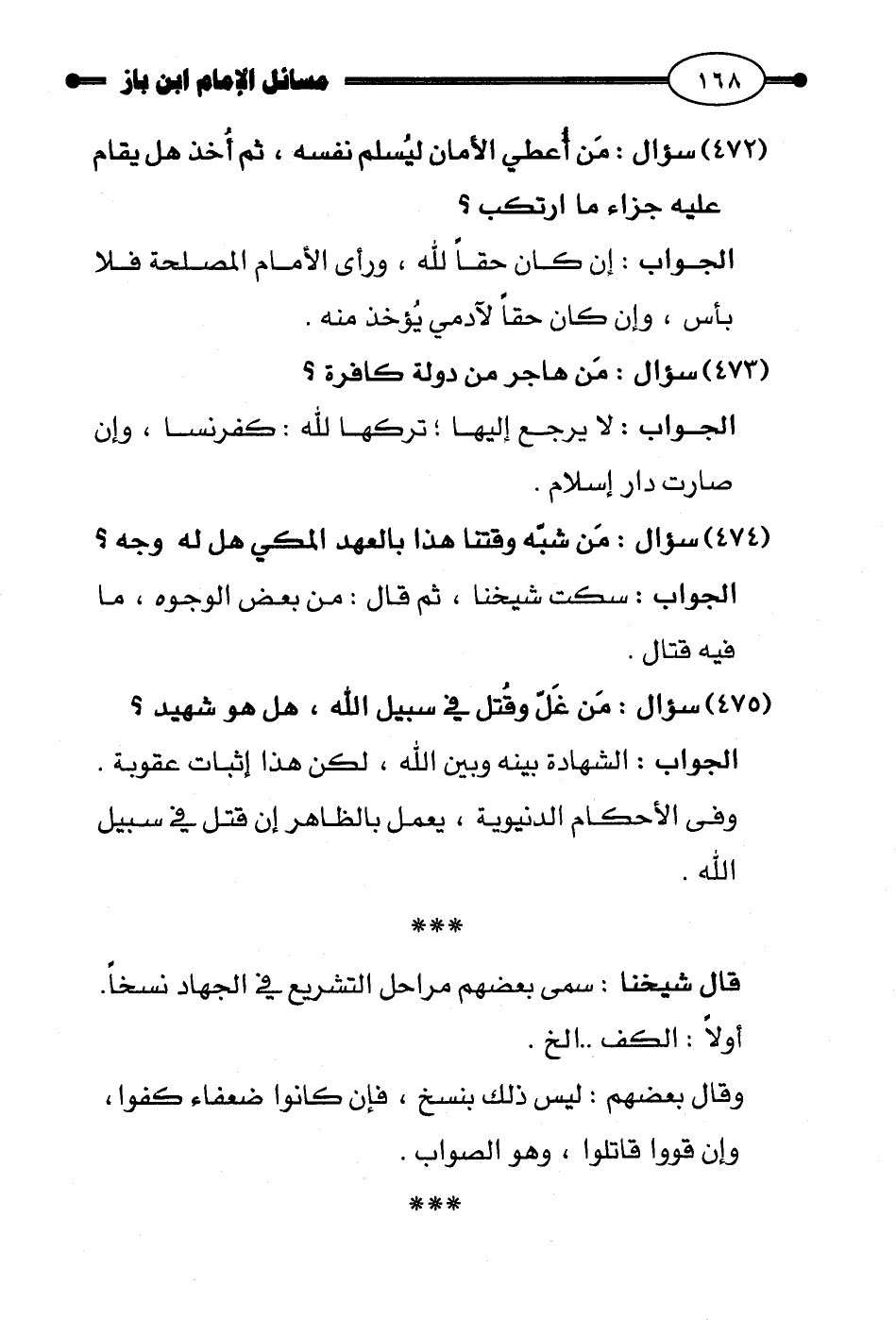 الجواب: سكت شيخنا، ثم قال: من بعض الوجوه، ما فيه قتال.