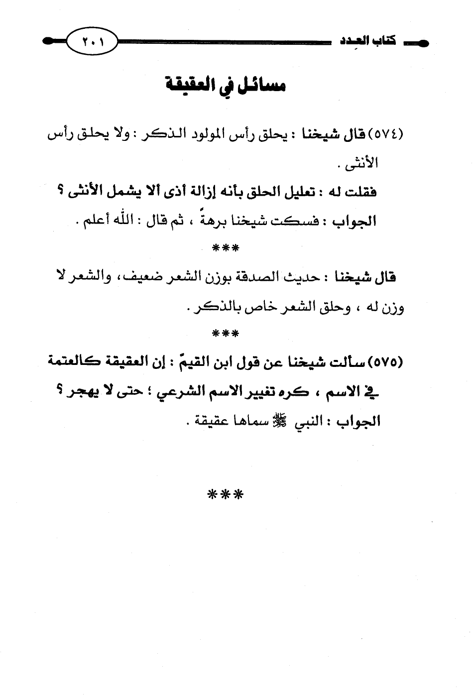 574 - قال شيخنا: يحلق رأس المولود الذكر: ولا يحلق رأس الأنثى.