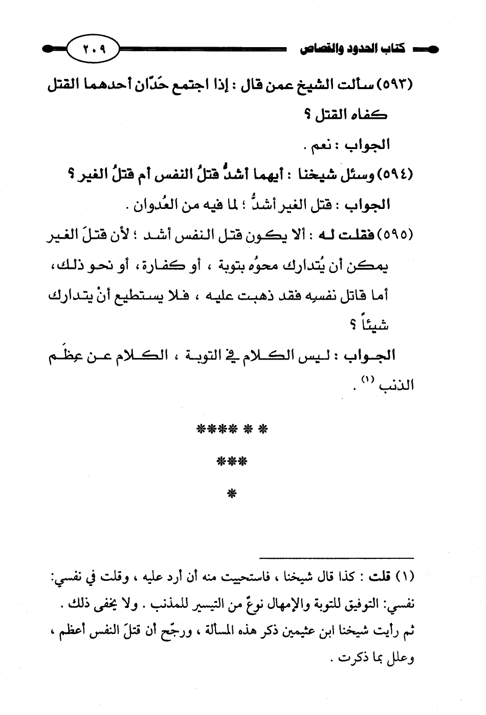 594 - وسئل شيخنا: أيهما أشدُّ قتلُ النفس أم قتلُ الغير؟