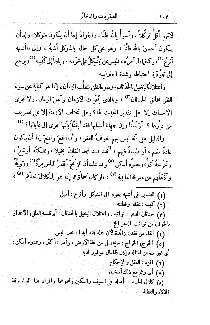 واعتلال البخيل بالحدثانِ، وسوء الظنّ بتقلّبِ الزمانِ، إنّما هو كنايةٌ عن سوء الظنّ بخالق الحَدثانِ، وبالذي يحدث الأزمانَ وأهلَ الزمانِ. ولا تجري الأحداثُ إلا على تقديرِ المُحْدِث لها؟ وهل تختلف الأزمنة إلا على تصريفِ من دبّرها؟ أولسنا وإن جهلنا أسبابَها فقد أيقنّا بأنها تجري إلى غاياتها؟