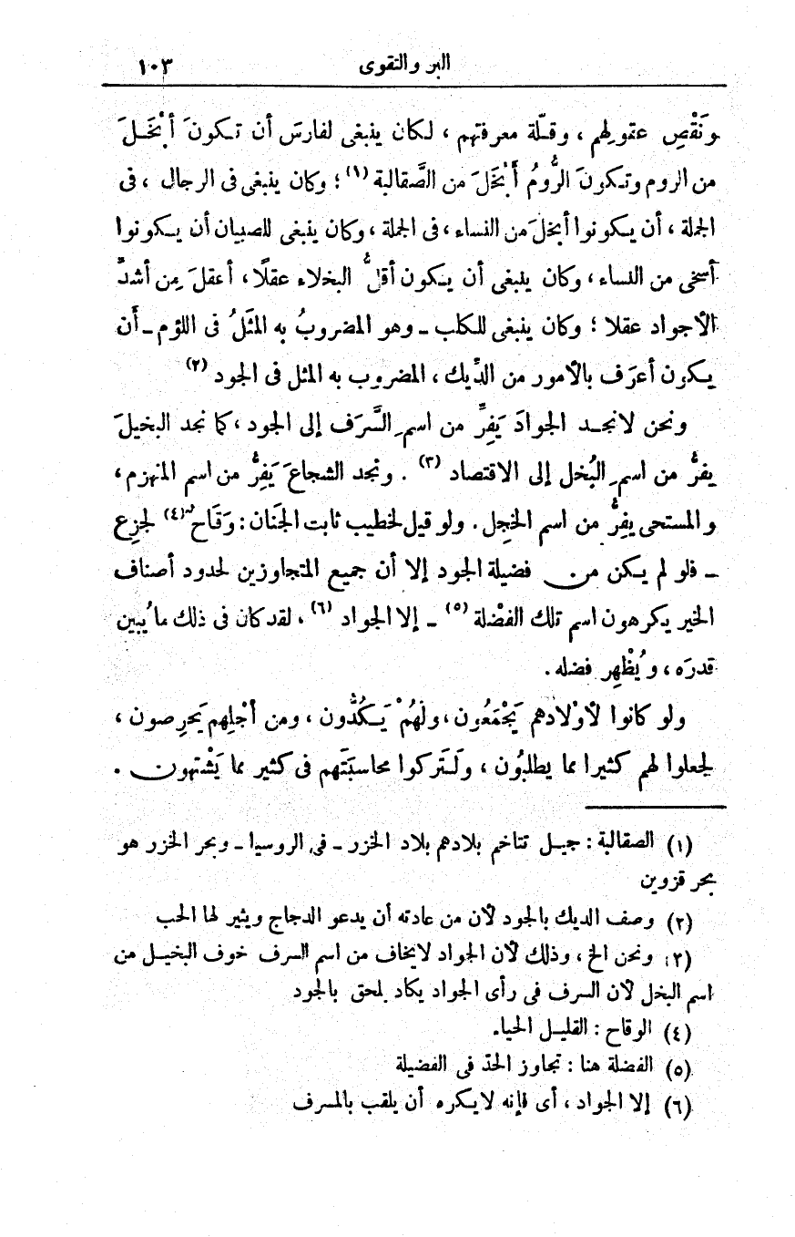 ونقصِ عقولهم، وقلّةِ معرفتهم، لكان ينبغي لفارسَ أن تكونَ أبخلَ من الرّوم وتكونَ الرومُ أبخلَ من الصّقالبة، وكان ينبغي في الرجال، في الجملة، أن يكونوا أبخلَ من النساء، في الجملة، وكان ينبغي للصبيان أن يكونوا أسخى من النساء، وكان ينبغي أن يكونَ أقلُّ البخلاء عقلاً، أعقلَ من أشدِّ الأجوادِ عقلاً؛ وكان ينبغي للكلب - وهو المضروب به المثل في اللؤم - أن يكونَ أعرفَ بالأمور من الديك، المضروب به المثلُ في الجود.