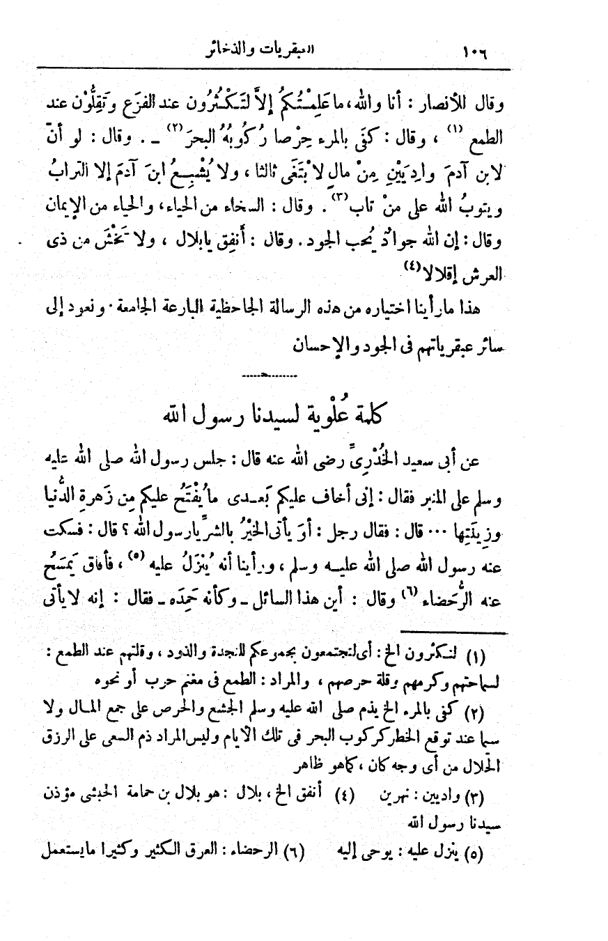 عن أبي سعيد الخُدْريّ رضي الله عنه قال: جلس رسول الله صلى الله عليه وسلم على المنبر فقال: إنّي أخاف عليكم بعدي ما يُفتح عليكم من زهرةِ الدنيا وزينتِها. . . قال: فقال رجل: أوَيأتي الخيرُ بالشرِّ يا رسولَ الله؟ قال: فسكت عنه رسول الله صلى الله عليه وسلم، ورأينا أنّه يُنْزَلُ عليه، فأفاقَ يسمح عنه الرُّحَضاءَ وقال: أين هذا السائل - وكأنّه حَمِدَه - فقال: إنّه لا يأتي