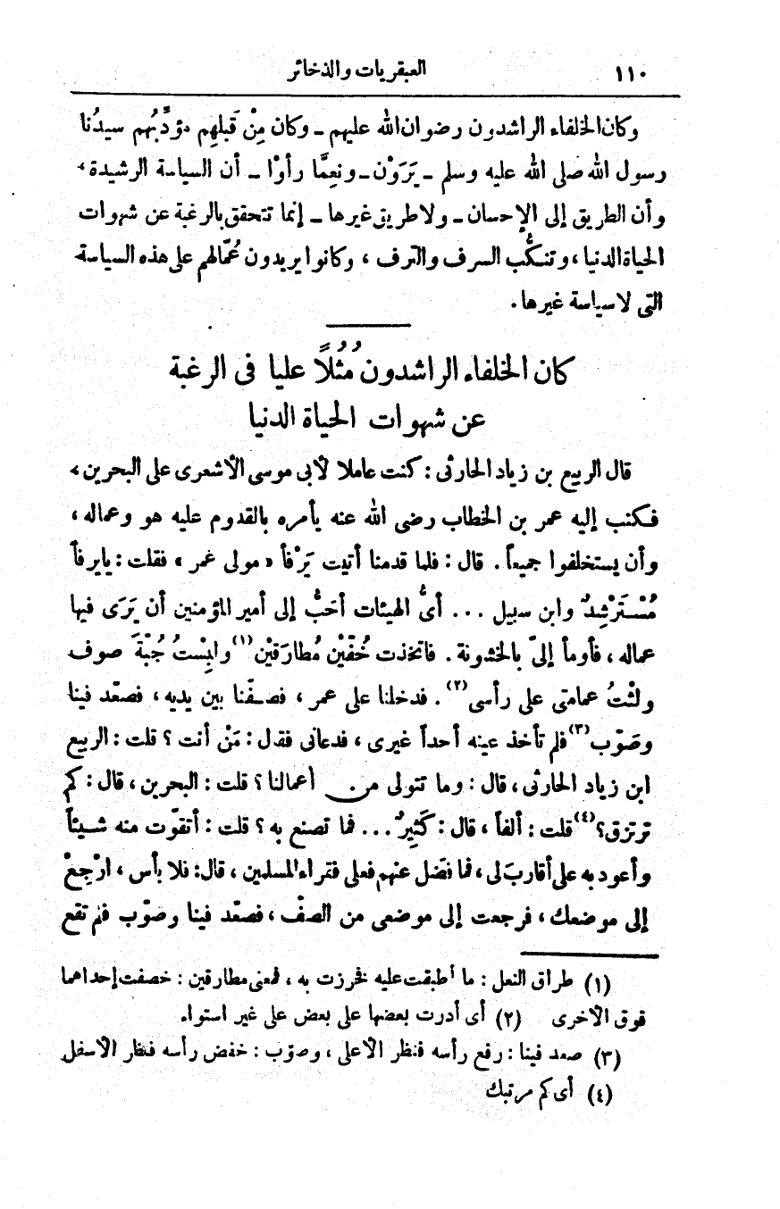 وكان الخلفاء الراشدون رضوان الله عليهم - وكان من قبلهم مؤدِّبُهم سيّدنا رسول الله صلى الله عليه وسلم - يَرَوْن - ونعِمّا رأوا - أن السياسة الرشيدة وأن الطريق إلى الإحسان - ولا طريق غيرُها - إنّما تتحقق بالرغبة عن شهوات الحياة الدنيا، وتنكُّبِ السّرفِ والتّرف، وكانوا يريدون عمالهم على هذه السياسة التي لا سياسةَ غيرها.