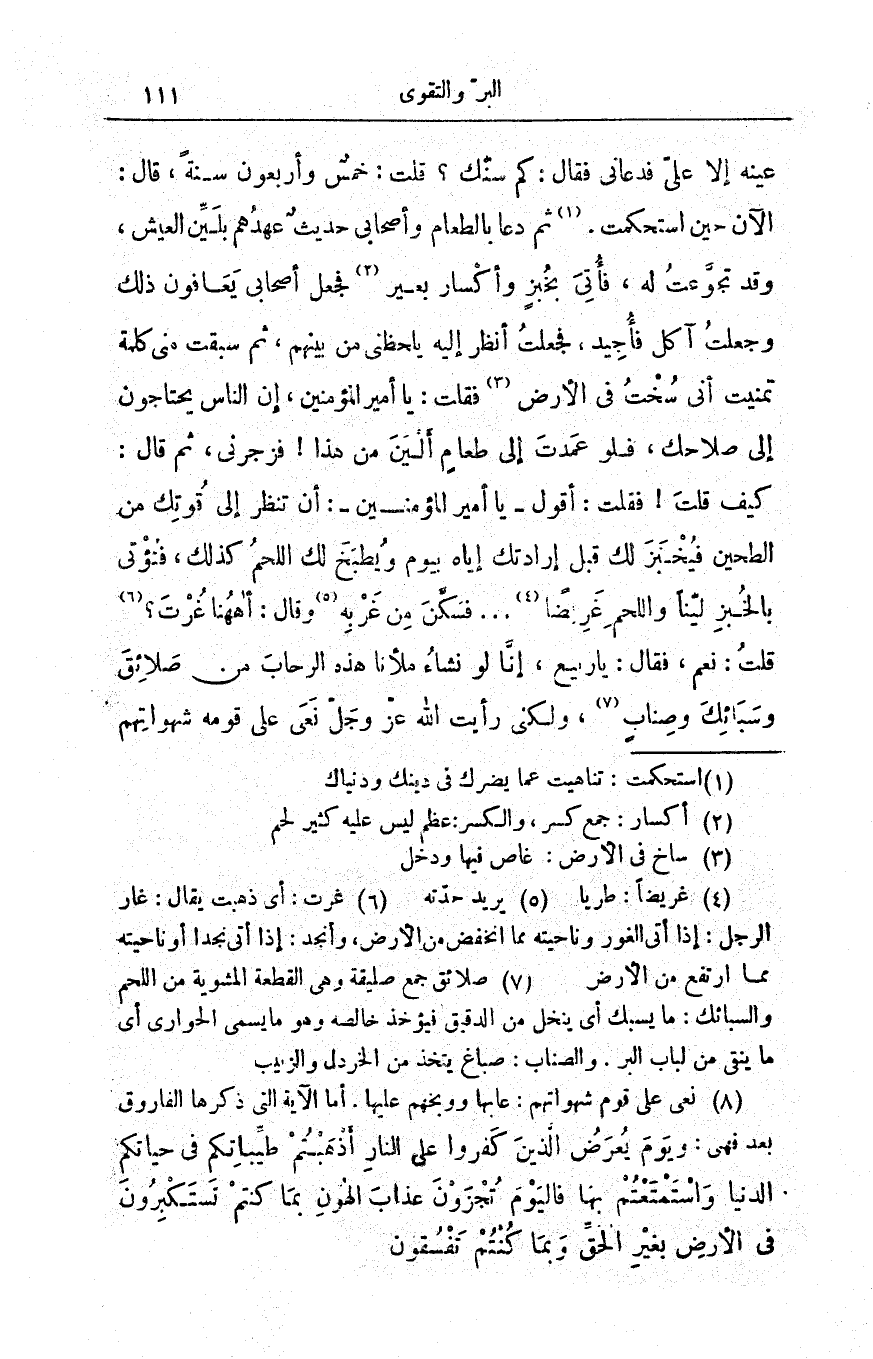 عينه إلا عليّ فدعاني فقال: كم سِنّك؟ قلت: خمس وأربعون سنةً، قال: الآن حين استحكمت. ثم دعا بالطعام وأصحابي حديثٌ عهدُهم بلين العيش، وقد تجوّعت له، فأتِي بخبزٍ وأكسارِ بعير فجعل أصحابي يعافون ذلك وجعلت آكلُ فأجيد، فجعلت أنظر إليه يلحظُني من بينهم، ثم سبقت مني كلمة تمنيت أنّي سُخْتُ في الأرض فقلت: يا أمير المؤمنين، إن الناس يحتاجون إلى صلاحك، فلو عمدت إلى طعامٍ ألينَ من هذا! فزجرني، ثم قال: كيف قلت! فقلت: أقول - يا أمير المؤمنين -: أن تنظر إلى قوتك من الطّحين فيخبز لك قبل إرادتِك إيّاه بيوم ويطبخ لك اللحم كذلك، فتؤتى بالخبز ليناً واللحم غريضاً. . فسَكَّن من غَرْبِه وقال: أهَهُنا غُرْتَ؟ قلت: نعم، قال: يا ربيع، إنّا لو نشاء ملأنا هذه الرحابَ من صلائقَ وسبائكَ وصِنابٍ، ولكني رأيت الله عزّ وجلَّ نعى على قومه شهواتِهم