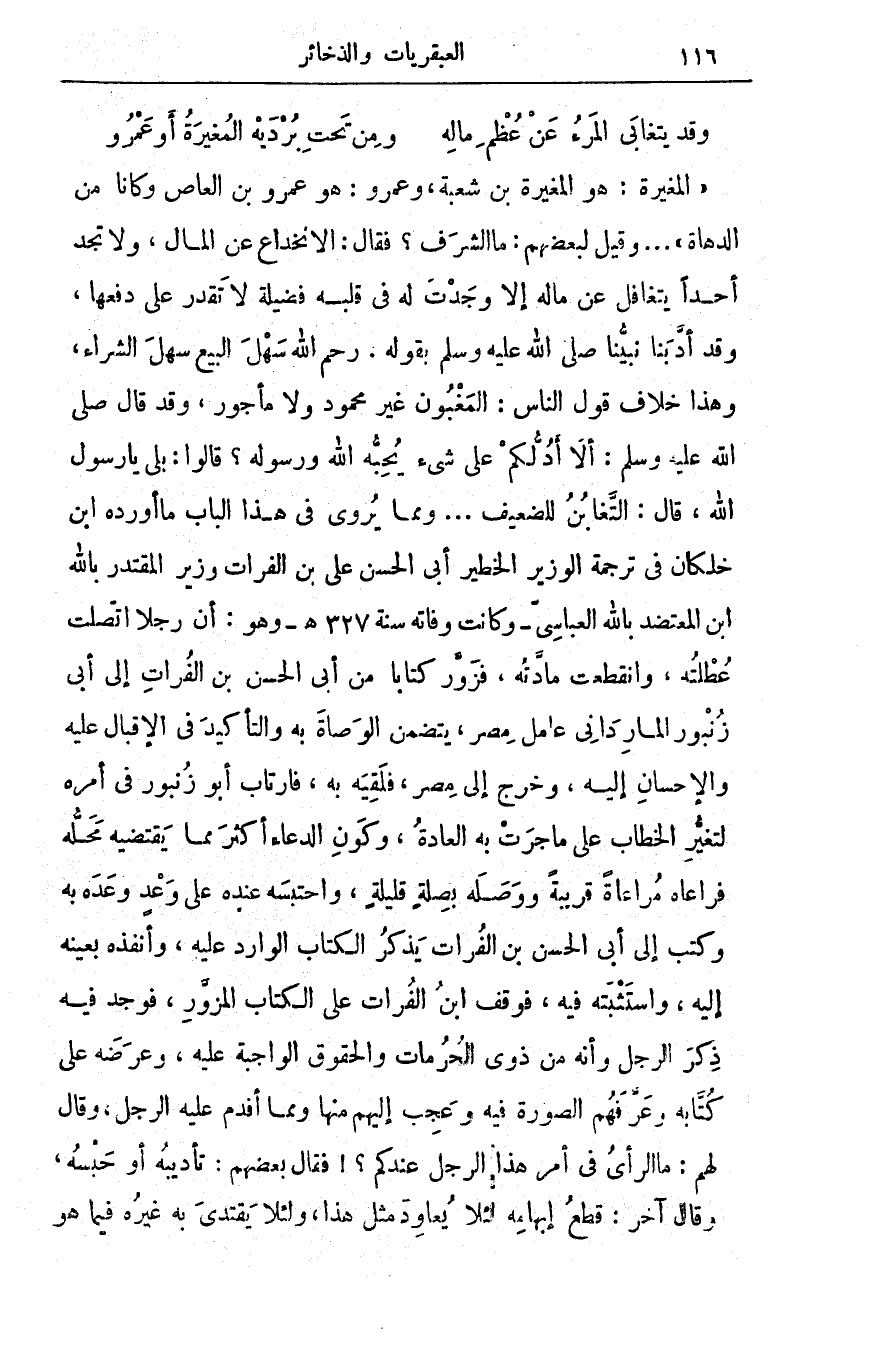 المغيرة: هو المغيرة بن شعبة، وعمرو: هو عمرو بن العاص وكانا من الدهاة. . . وقيل لبعضهم: ما الشّرف؟ فقال: الانخداع عن المالِ، ولا تجد أحداً يتغافل عن مالِه إلا وجدْتَ له في قلبه فضيلةً لا تقدر على دفعها، وقد أدّبنا نبيُّنا صلى الله عليه وسلم بقوله: (رحم الله سهلَ البيعِ سهلَ الشراء)، وهذا خلاف قول الناس: المَغبون غيرُ محمودٍ ولا مأجور، وقد قال صلى الله عليه وسلم: (ألا أدلّكم على شيء يحبّه اللهُ ورسوله؟ قالوا: بلى يا رسول الله، قال: التَّغابُنُ للضعيف). . . ومما يُروى في هذا الباب ما أورده ابن خِلكان في ترجمة الوزير الخطير أبي الحسن علي بن الفرات وزير المقتدر بالله ابن المعتضد بالله العباسي -