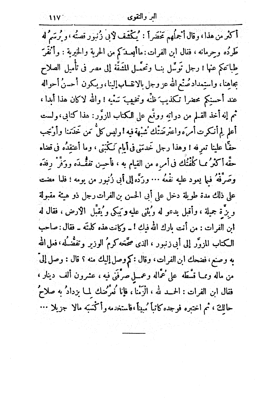 أكثرُ من هذا، وقال أجملهم محضراً: يُكشف لأبي زُنْبور قصتُه، ويرسم له طردُه وحِرمانُه، فقال ابن الفرات: ما أبعدَكم من الحرية والخيريّة، وأنفر طباعكم عنها! رجلٌ توسّل بنا وتحمّل المشقّة إلى مصر في تأميلِ الصّلاح بجاهنا، واستمدادِ صنعِ الله عزّ وجلّ بالانتساب إلينا، ويكون أحسنُ أحواله عند أحسنكم محضراً تكذيبَ ظنّه وتخييبَ سعيِه! والله لا كان هذا أبداً، ثم إنه أخذ القلم من دواتِه ووقّع على الكتاب المزوّر: هذا كتابي، ولست أعلم لم أنكرتَ أمرَه واعترضَتْك شبهةٌ فيه! وليس كل من خدمنا وأوجب حقاً علينا تعرفه! وهذا رجل خدمني في أيام نكبتي، وما أعتقده في قضاء حقّه أكثر ممّا كلّفتك في أمره من القيام به، فأحسِنْ تفقُّدَه ووفّر رِفدَه وصَرِّفْه فيما يعود عليه نفعُه. . . وردّه إلى أبي زُنبور من يومه، فلما مضت على ذلك مدة طويلة دخل على أبي الحسن بن الفرات رجل ذو هيئة مقبولة وبِزّةٍ جميلة، وأقبل يدعو له ويثني عليه ويبكي ويقبّل الأرض، فقال له ابن الفرات: من أنت بارك اللهُ فيك! - وكانت هذه كلمته - فقال: صاحب الكتاب المزوّر إلى أبي زُنبور، الذي صحّحه كرمُ الوزير وتفضُّله، فعل الله به وصنع، فضحك ابن الفرات، وقال: كم وصل إليك منه؟ قال: وصل إليّ من ماله ومما قسّطه على عُمّاله وعملٍ صرّفني فيه، عشرون ألف دينار، فقال ابن الفرات: الحمدُ لله، الْزَمنا، فإنا نعرِّضك لما يزداد به صلاحُ حالك، ثم اختبره فوجده كاتباً مبيناً، فاستخدمه وأكسبه مالاً جزيلاً. . .