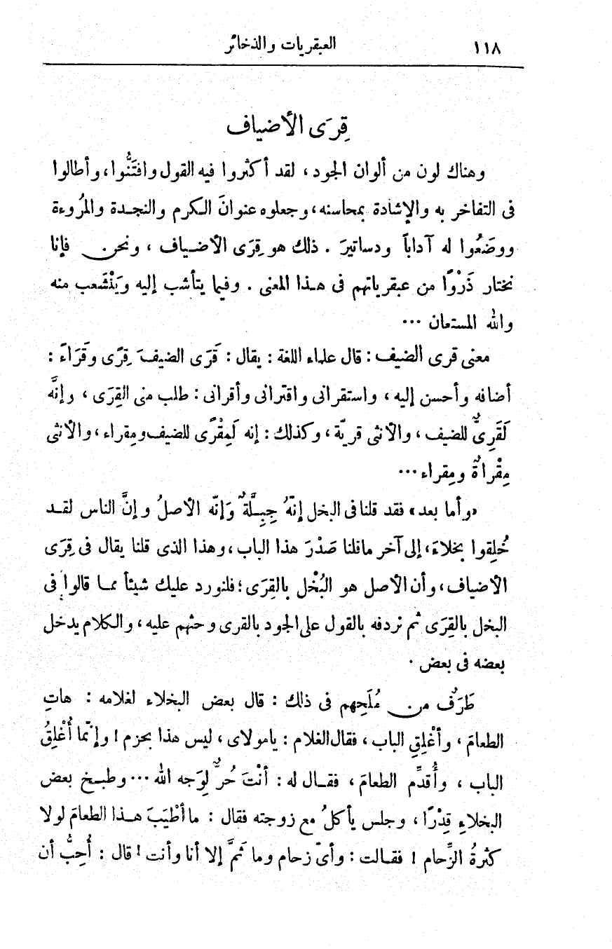 وأما بعد فقد قلنا في البخل إنه جِبِلّةٌ وإنّه الأصل وإنّ الناس لقد خُلقوا بُخلاء، إلى آخر ما قلنا صدرَ هذا الباب، وهذا الذي قلنا يقال في قِرى الأضياف، وأنَّ الأصل هو البخلُ بالقِرى، فلنورد عليك شيئاً مما قالوا في البُخل بالقِرى ثم نُردفه بالقول على الجود بالقِرى وحثِّهم عليه، والكلام يدخل بعضُه في بعض.