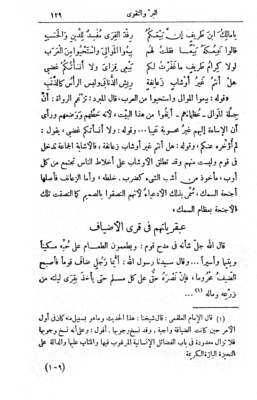 قال الله جلّ شأنه في مدح قوم: {وَيُطْعِمُونَ الطَّعَامَ عَلَى حُبِّهِ مِسْكِيناً وَيَتِيماً وَأَسِيراً}. . . وقال سيدنا رسول الله: (أيُّما رجلٍ ضافَ قوماً فأصبح الضيفُ مَحْروماً، فإنَّ نصرَه حقٌّ على كل مسلم حتّى يأخذَ بقِرى ليلته من زَرْعِه ومالِه). . .