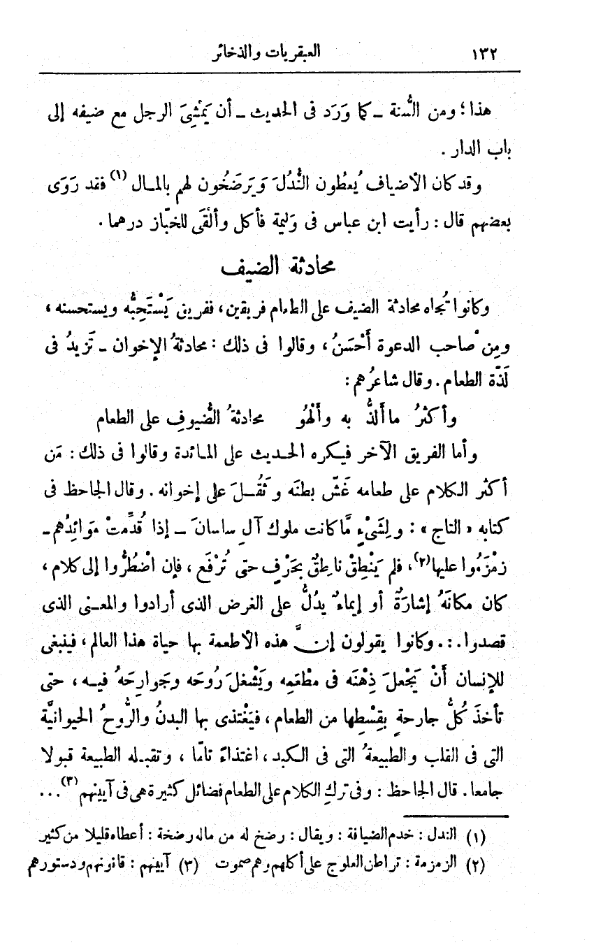 وكانوا تُجاه محادثةِ الضيف على الطّعام فريقين، ففريقٌ يستحبُّه ويستحْسِنه، ومِن صاحب الدعوةِ أحسنُ، وقالوا في ذلك: مُحادثةُ الإخوان - تزيدُ في لذَّة الطعام. وقال شاعرهم: