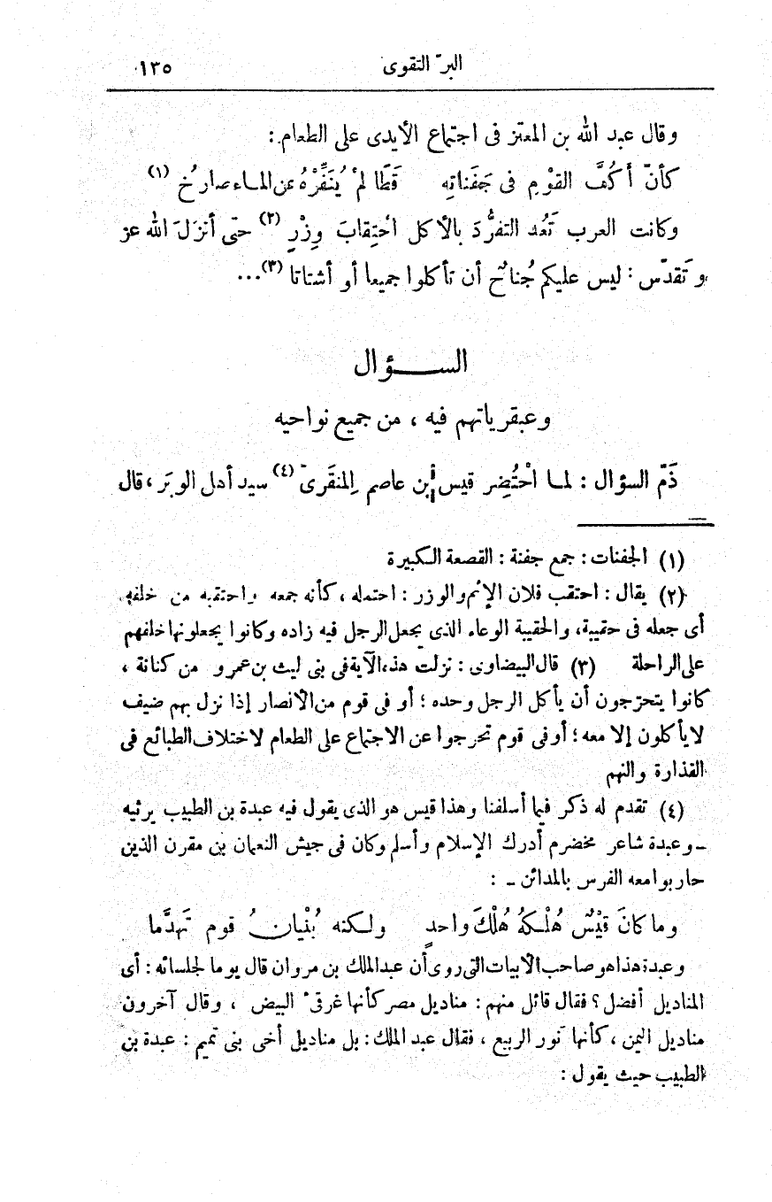 وكانت العرب تعدُّ التفرَّدَ بالأكل احتقابَ وِزْرٍ حتى أنزل الله عز وتقدّس: (ليس عليكم جناحٌ أن تأكلوا جميعاً أو أشتاتاً). . .