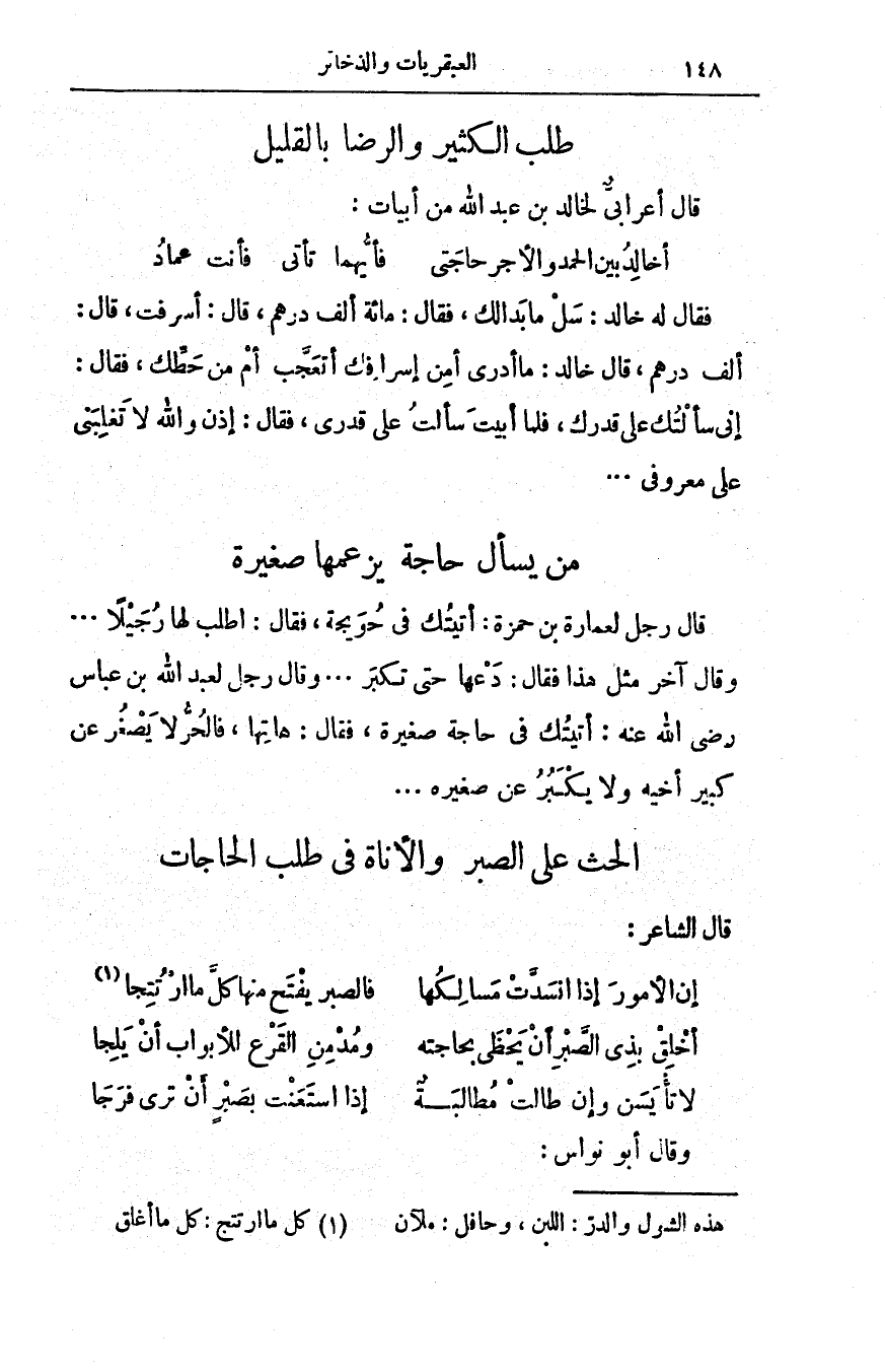قال رجل لعمارةَ بن حمزة: أتيتك في حُوَيْجة، فقال: اطلب لها رُجَيْلاً. . . وقال آخر مثل هذا فقال: دَعْها حتّى تَكْبَر. . . وقال رجل لعبد الله بن عباس رضي الله عنه: أتيتك في حاجةٍ صغيرة، فقال: هاتِها، فالحُرُّ لا يصغُرُ عن كبيرِ أخيه ولا يكْبُرُ عن صغيره.
