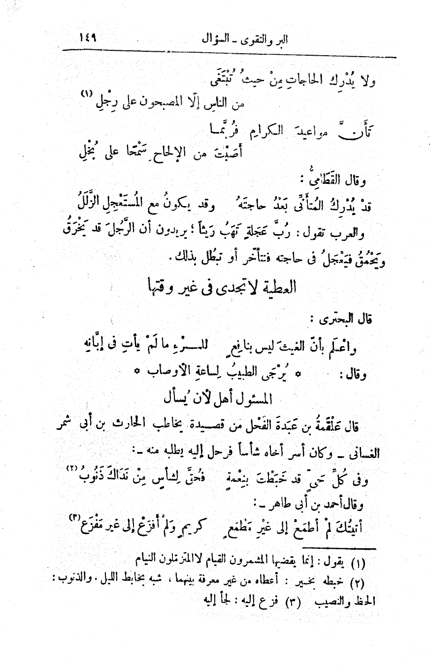 ولا يُدْرِك الحاجاتِ مِنْ حيثُ تُبْتَغَى ... من الناسِ إلاّ المُصْبِحون على رِجْلِ