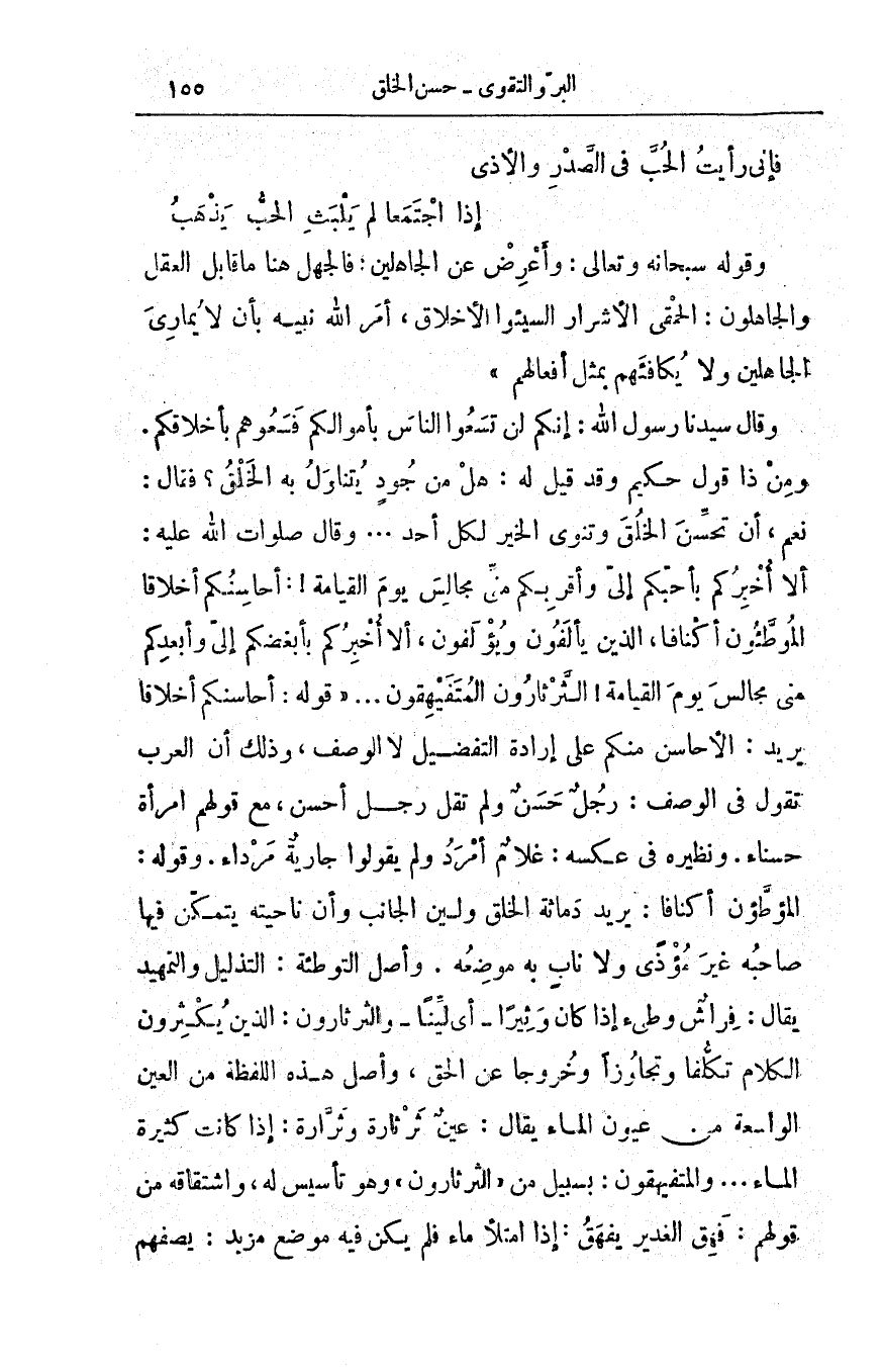 وقال سيدنا رسول الله: (إنكم لن تَسعوا الناسَ بأموالِكم فسَعوهم بأخلاقكم). ومن ذا قولُ حكيم وقد قيل له: هل من جودٍ يُتناول به الخَلْقُ؟ فقال: نعم، أن تحسن الخُلُقَ وتنوي الخيرَ لكل أحد. . . وقال صلوات الله عليه: (ألا أخبركم بأحبّكم إليّ وأقربكم مني مجالسَ يوم القيامة!: أحاسنكم أخلاقاً الموطَّؤون أكنافاً، الذين يألفون ويؤلفون، ألا أخبركم بأبغضكم إليّ وأبعدكم مني مجالسَ يوم القيامة! الثّرثارون المتفيهقون). . . قوله: أحاسنكم أخلاقاً يريد: الأحاسنَ منكم على إرادة التفضيل لا الوصف، وذلك أن العرب تقول في الوصف: رجلٌ حَسنٌ ولم تقل رجلٌ أحسن، مع قولهم امرأة حسناء. ونظيره في عكسه: غلامٌ أمردُ ولم يقولوا جارية مرداء. وقوله: الموطؤون أكنافاً: يريد دماثة الخُلق ولينَ الجانبِ وأن ناحيته يتمكّن فيها صاحبه غير مؤذًى ولا نابٍ به موضعُه. وأصل التوطئة: التذليل والتمهيد يقال: فراشٌ وطيءٌ إذا كان وثيراً - أي ليّناً - والثرثارون: الذين يكثرون الكلامَ تكلّفاً وتجاوُزاً وخروجاً عن الحق، وأصل هذه اللفظة من العينِ الواسعة من عيون الماء يقال: عينٌ ثَرْثارة وثَرّارة: إذا كانت كثيرةَ الماء. . . والمتفيهقون: بسبيل من الثرثارون وهو تأسيس له، واشتقاقه من قولهم: فَهِقَ الغَديرُ يَفْهَقُ: إذا امتلأ ماءً فلم يكن فيه موضعٌ مزبدٌ: يصفهم