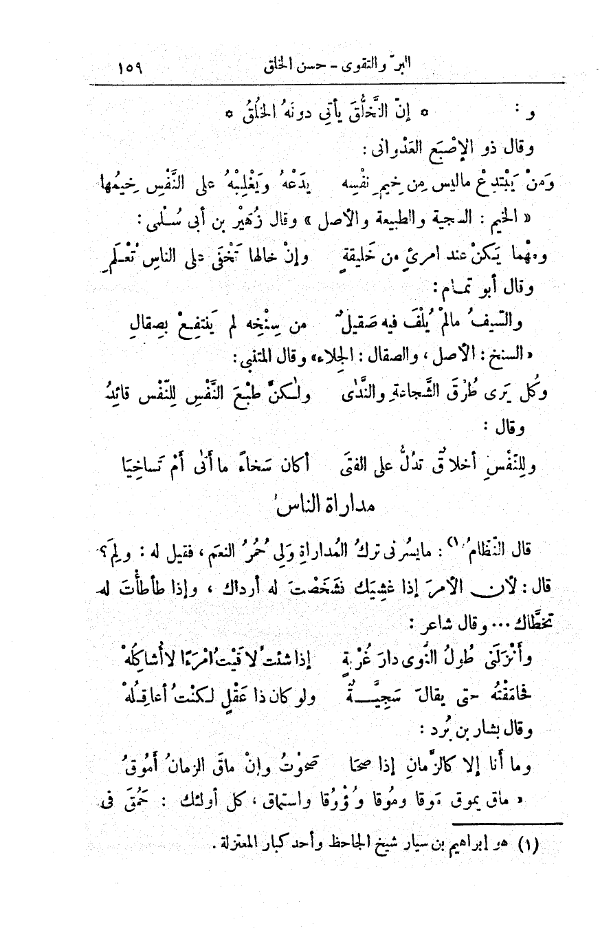 قال النظّام: ما يسرّني تركُ المداراة ولي حُمْرُ النّعَم، فقيل له: ولِمَ؟ قال: لأن الأمر إذا غشيك فشخَصْتَ له أرْداك، وإذا طأطأت له تخطّاك. . . وقال شاعر: