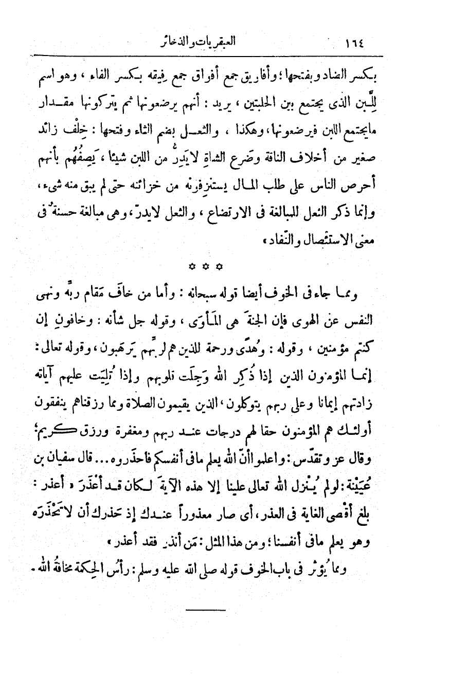 رَزَقْنَاهُمْ يُنفِقُونَ، أُوْلَئِكَ هُمُ الْمُؤْمِنُونَ حَقّاً لَّهُمْ دَرَجَاتٌ عِندَ رَبِّهِمْ وَمَغْفِرَةٌ وَرِزْقٌ كَرِيمٌ}، وقال عز وتقدس: {وَاعْلَمُواْ أَنَّ اللهَ يَعْلَمُ مَا فِي أَنفُسِكُمْ فَاحْذَرُوهُ}. . قال سفيان بن عُيينة: لو لم ينزّل الله تعالى علينا إلا هذه الآية لكان قد أعذَرَ أعذر: بلغَ أقصى الغاية في العذر، أي صار معذوراً عندك إذ حذّرك أن لا تحذره وهو يعلم ما في أنفسنا، ومن هذا المثل: مَنْ أنْذرَ فقد أعْذرَ.