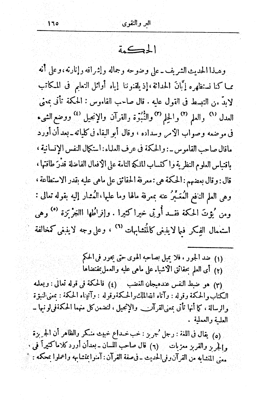وهذا الحديث الشريف - على وضوحه وجماله وإشراقه وإنارته، وعلى أنه ممّا كنّا نستظهره إبّان الحداثة، إذ يلقّنوننا إيّاه أوائل التعليم في المكاتب لا بدَّ من التبسّط في القول عليه. قال صاحب القاموس: الحكمة تأتي بمعنى العدل والعلم والحلم والنبوة والقرآن والإنجيل ووضع الشيء في موضعه وصواب الأمر وسداده، وقال أبو البقاء في كلياته - بعد أن أورد ما قال صاحب القاموس -: والحكمة في عرف العلماء: استكمالُ النفس الإنسانية، باقتباس العلوم النظرية واكتساب الملكة التامة على الأفعال الفاضلة قدرَ طاقتها، قال: وقال بعضهم: الحكمة هي: معرفة الحقائق على ما هي عليه بقدر الاستطاعة، وهي العلم النافع المعبَّر عنه بمعرفة ما لها وما عليها، المشار إليه بقوله تعالى: {وَمَن يُؤْتَ الْحِكْمَةَ فَقَدْ أُوتِيَ خَيْراً كَثِيراً}. وإفراطُها الجَرْبزة وهي استعمال الفكر فيما لا ينبغي كالمتشابهات، وعلى وجه لا ينبغي كمخالفة