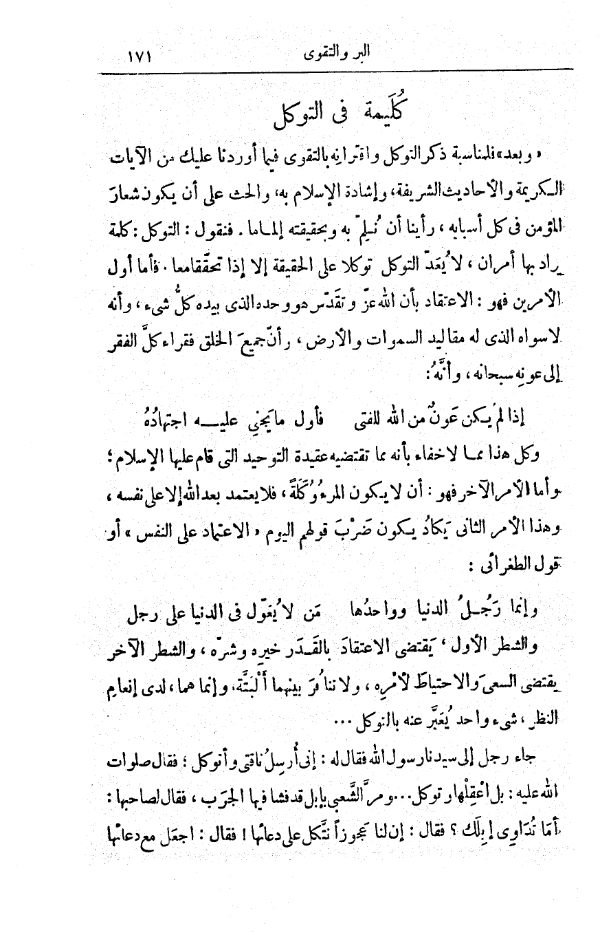 وكل هذا ممّا لا خفاءَ بأنّه ممّا تقتضيه عقيدةُ التّوحيد التي قام عليها الإسلام؛ وأما الأمر الآخر فهو: أن لا يكونَ المرءُ وَكَلةً، فلا يعتمد بعد اللهِ إلا على نفسِه، وهذا الأمر الثاني يكاد يكون ضربَ قولهم اليوم الاعتماد على النفس أو قول الطّغرائيّ: