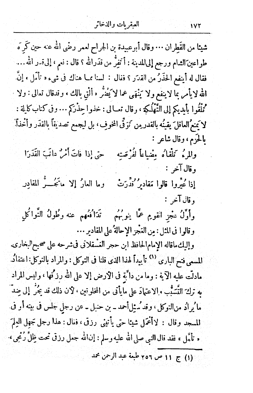 شيئاً من القَطِران. . . وقال أبو عبيدةَ بن الجراح لعمرَ رضي الله عنه حين كره طواعين الشام ورجع إلى المدينة: أتفرُّ من قدرِ الله؟ قال: نعم، إلى قدرِ الله. . . فقال له أينفع الحذرُ من القدر؟ فقال: لسنا ممّا هناك في شيءٍ تأمل إنّ الله لا يأمر بما لا ينفع ولا ينهى عما لا يضرُّ ألقِِ بالَك وقد قال تعالى: {وَلاَ تُلْقُواْ بِأَيْدِيكُمْ إِلَى التَّهْلُكَةِ}، وقال تعالى: {خُذُواْ حِذْرَكُمْ}. . . وفي كتاب كليلة: لا يمنع العاقلَ يقينُه بالقدرِ مِن توقّي المخوفِ، بل ليجمعَ تصديقاً بالقدرِ وأخذاً بالحزمِ، وقال شاعر: