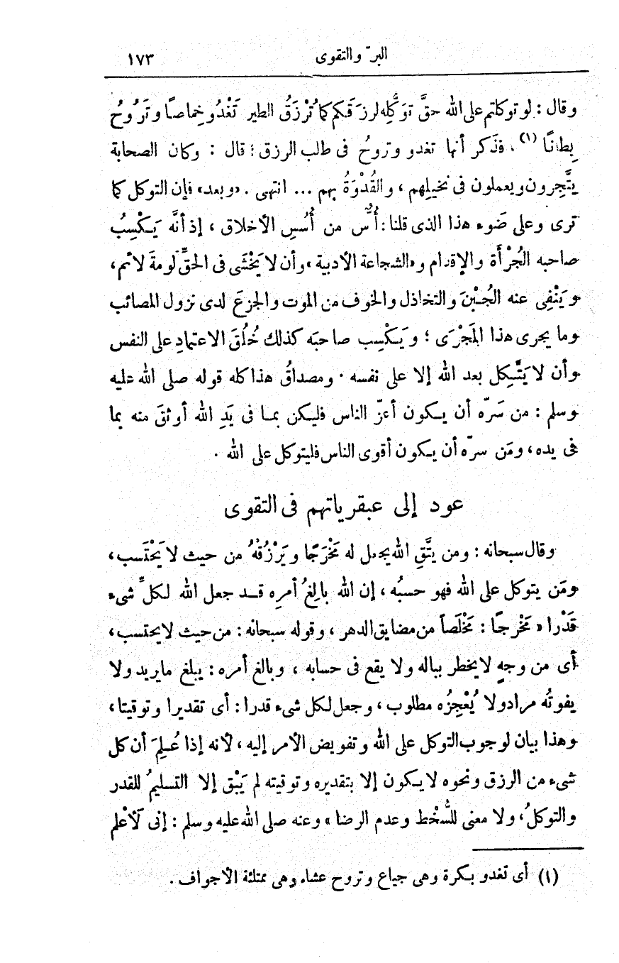وقال: (لو توكّلتم على الله حقَّ توكُّله لزرقكم كما تُرزق الطّير تغدو خِماصاً وتروح بِطاناً)، فذكر أنها تغدو وتروح في طلب الرزق؛ قال: وكان الصحابة يَتَّجرون ويعملون في نخيلهم، والقدوةُ بهم. . . انتهى.
