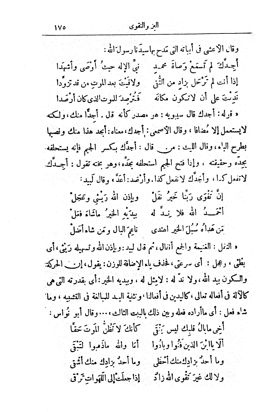 النفل: الغنيمة والجمع أنفال، ثم قال لبيد: وبإذن الله وتسهيله ريثي، أي بُطئي، وعجل: أي سرعتي، فحذف ياء الإضافة للوزن: يقول، إنّ الحركة والسكون بيد الله، ولا ندَّ له: لا مثل له، وبيده الخير: أي بقدرته التي هي كالآلة في أفعالِه تعالى، كاليدين في أفعالنا، وتثنية اليدِ للمبالغة في التشبيه، وما شاء فعل: أي ما أراده فعله وبيّن ذلك بالبيت الثالث. . . وقال أبو نواس: