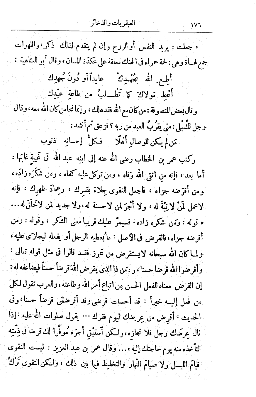 وكتب عمر بن الخطاب رضي الله عنه إلى ابنه عبد الله في غيبةٍ غابها: أما بعد، فإنّه من اتقى اللهَ وقاه، ومن توكَّل عليه كفاه، ومن شكَرَه زادَه، ومن أقرضَه جزاه، فاجعلِ التقوى جلاءَ بصرك، وعمادَ ظهرك، فإنّه لا عملَ لمن لا نِيّةَ له، ولا أجرَ لمن لا حسنة له، ولا جديدَ لمن لا خَلَقَ له. . .