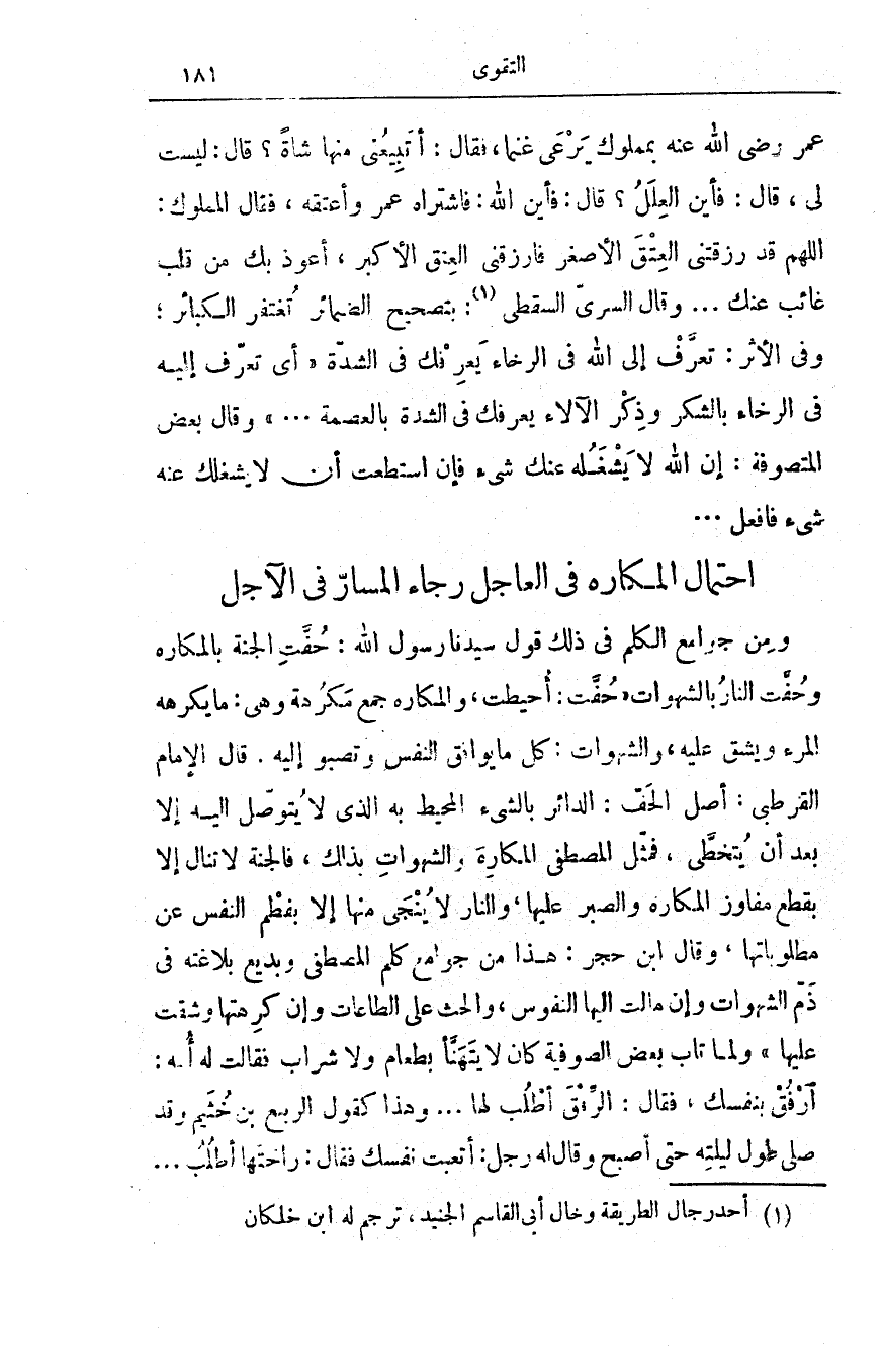 ومن جوامع الكَلِمِ في ذلك قول سيّدنا رسول الله: (حُفَّت الجنةُ بالمكارهِ وحُفّت النارُ بالشهوات) حفّت: أحيطت، والمكاره جمع مَكْرُهة وهي: ما يكرهه المرءُ ويشقُّ عليه، والشهوات: كل ما يوافق النفسَ وتصبو إليه. قال الإمام القرطبي: أصل الحَفّ: الدائرُ بالشيء المحيطُ به الذي لا يُتوصَّل إليه إلا بعد أن يُتَخطّى، فمثّل المصطفى المكارهَ والشهواتِ بذلك، فالجنّة لا تُنالُ إلا بقطع مفاوزِ المكارهِ والصبرِ عليها، والنارُ لا يُنْجى منها إلا بفطمِ النفسِ عن مطلوباتها، وقال ابن حجر: هذا من جوامعِ كلمِ المصطفى وبديعِ بلاغتِه في ذمِّ الشهوات وإن مالت إليها النفوس، والحثّ على الطاعات وإن كرهتها وشقَّت عليها ولما تاب بعضُ الصوفيّة كان لا يَتَهنّأ بطعامٍ ولا شرابٍ فقالت له أمُّه: ارْفِقْ بنفسِك، فقال: الرِّفْقَ أطلبُ لها. . . وهذا كقول الربيع بن خُثَيم وقد صلى طولَ ليلته حتى أصبحَ