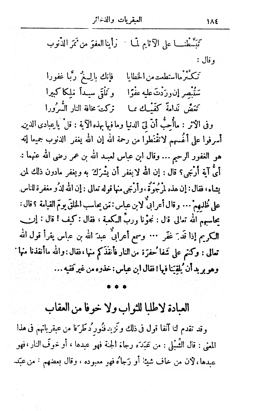 وقد تقدّم لنا آنفاً في ذلك ونزيد فنوردُ طرفاً من عبقريّاتهم في هذا المعنى: قال الشّبلي: من عبَدَه رجاءَ الجنَّة فهو عبدُها، أو خوفَ النار، فهو عبدُها، لأنَّ من خاف شيئاً أو رجاه فهو معبودُه، وقال بعضهم: من عبدَ