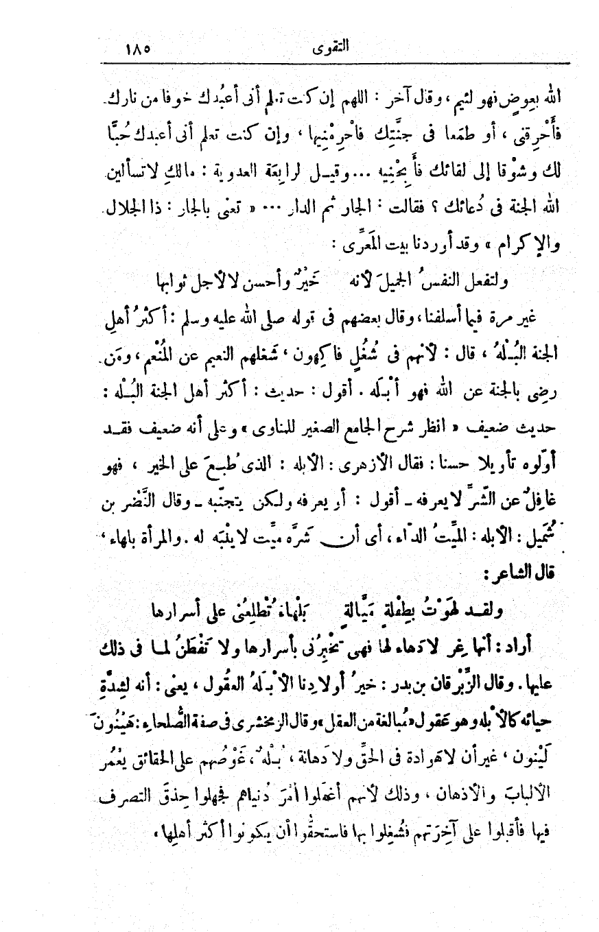 دعائِك؟ فقالت: الجارُ ثمَّ الدار. . . تعني بالجار: ذا الجلالِ والإكرام وقد أوردنا بيتَ المعرّي: