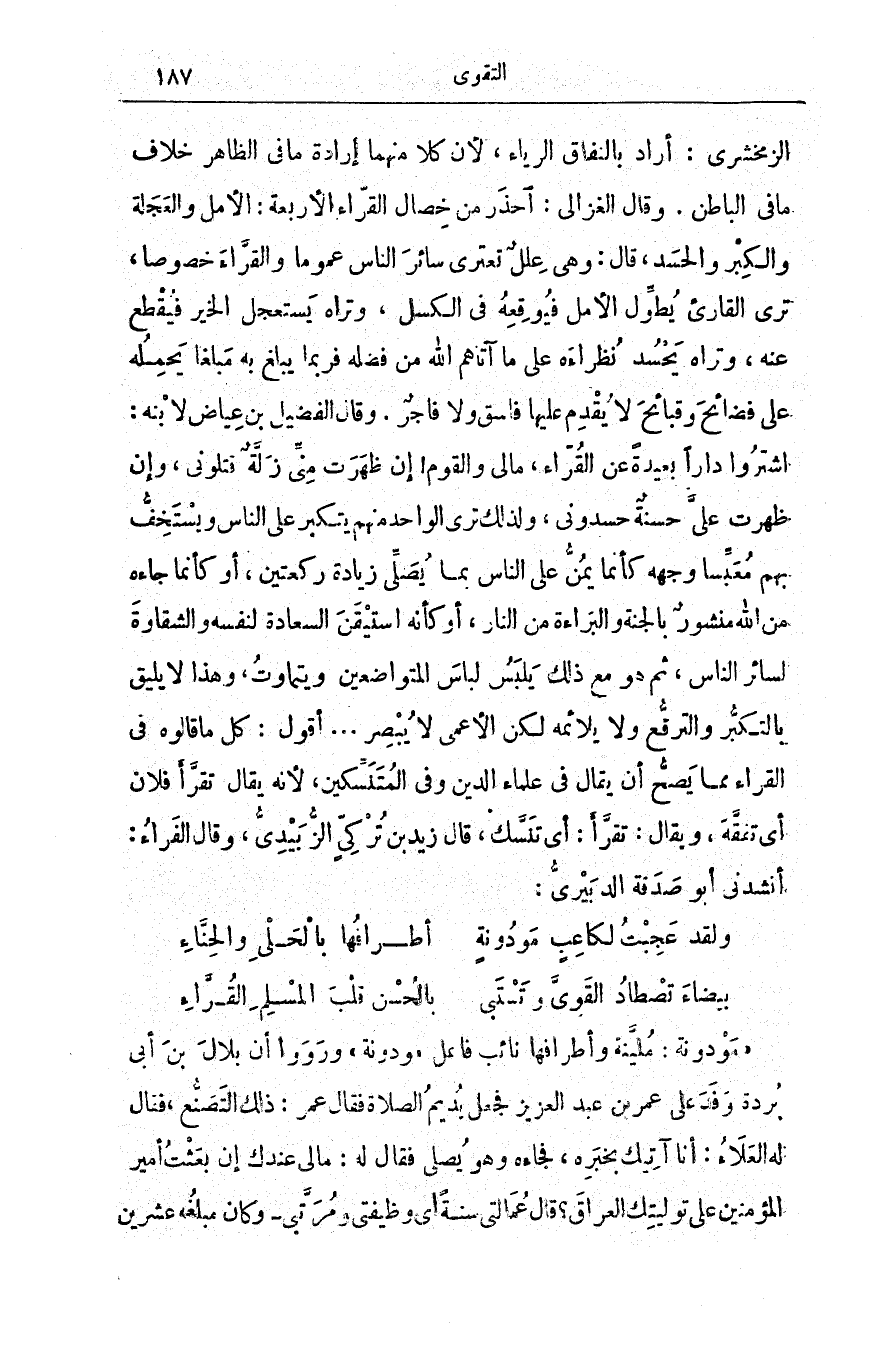 الزّمخشريُّ: أراد بالنفاقِ الرياءَ، لأنَّ كلاً منهما إرادةُ ما في الظاهر خلافَ ما في الباطنِ. وقال الغزاليُّ: احذر من خِصال القرّاءِ الأربعة: الأمل والعجلة والكِبر والحسد، قال: وهي عِلَلٌ تعتري سائرَ الناس عموماً والقرّاءَ خصوصاً، ترى القارئ يطوِّلُ الأملَ فيوقعُه في الكسل، وتراه يستعجل الخيرَ فيُقْطعُ عنه، وتراه يحسد نظراءَه على ما آتاهم اللهُ من فضلِه فربَّما يبلغ به مبلغاً يحملُه على فضائحَ وقبائحَ لا يقدم عليها فاسقٌ ولا فاجر. وقال الفضيل بن عياض لابنه: اشتروا داراً بعيدةً عن القُرّاء، ما لي والقوم! إن ظهرت منّي زلّةٌ قتلوني، وإن ظهرت عليَّ حسنةٌ حَسدوني، ولذلك ترى الواحدَ منهم يتكبّر على الناس ويستخفُّ بهم مُعْبِساً وجهَه كأنّما يمنُّ على الناسِ بما يصلي زيادةَ ركعتين، أو كأنما جاءَه من اللهِ منشورٌ بالجنة والبراءةِ من النار، أو كأنّه استيقن السعادةَ لنفسِه والشقاوةَ لسائر الناس، ثم هو مع ذلك يلبَسُ لباسَ المُتواضعين ويتماوت، وهذا لا يليقُ بالتكبُّر والترفُّع ولا يلائِمُه لكنَّ الأعمى لا يبصر. . . أقول: كل ما قالوه في القُرّاء ممّا يصح أن يقال في علماء الدين وفي المتنسِّكين، لأنه يقال تقرّأ فلانٌ أي تفقّه، ويقال: تقرّأ: أي تنسّك، قال زيد بن تركي الزُّبيديُّ: وقال الفراء: أنشدني أبو صَدْفة الدبَيْري: