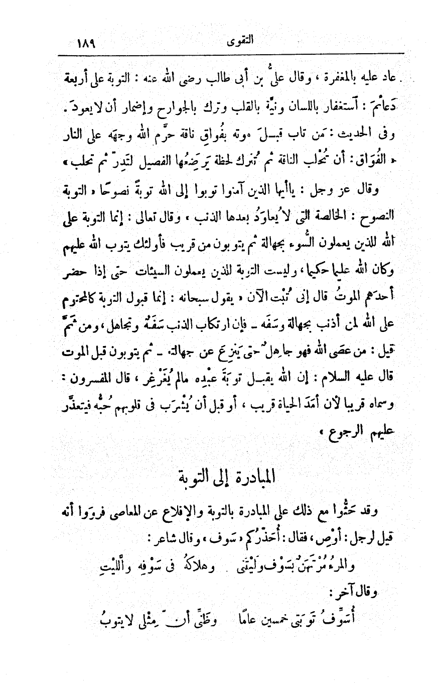 عادَ عليه بالمغفرة، وقال علي بن أبي طالب رضي الله عنه: التوبةُ على أربعةِ دعائم: استغفار باللسان ونيّة بالقلب وترك بالجوارح وإضمار أنْ لا يعود. وفي الحديث: (من تابَ قبل موتِه بفُواقِ ناقةٍ حرَّم اللهُ وجهَه على النار) الفواق: أن تُحلبَ الناقةُ ثم تترك لحظةً يَرْضِعُها الفصيلُ لتدرَّ ثُمّ تُحلب.