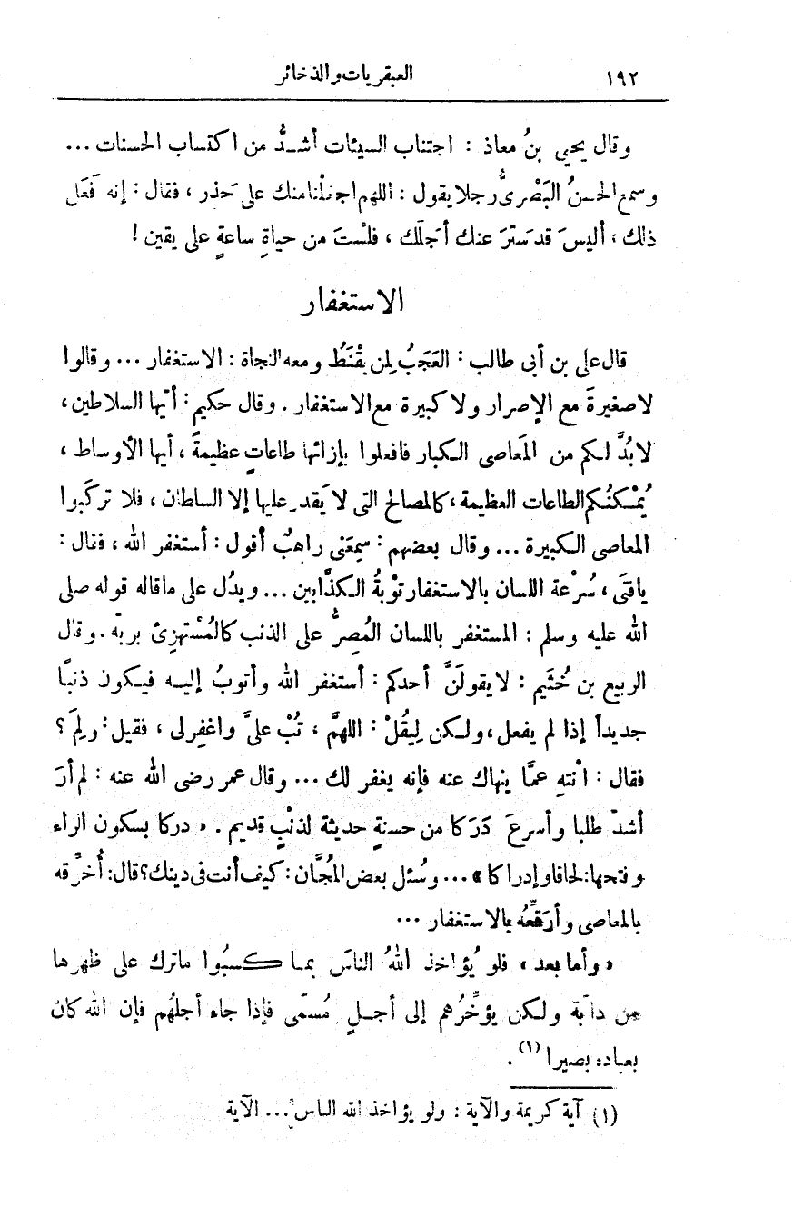 قال علي بن أبي طالب: العجبُ لِمَنْ يَقْنَطُ ومعه النجاة: الاستغفار. . . وقالوا لا صغيرةَ مع الإصرار ولا كبيرةَ مع الاستغفار. وقال حكيم: أيّها السلاطين، لا بدَّ لكم من المعاصي الكبار فافعلوا بإزائِها طاعاتٍ عظيمةً، أيّها الأوساطُ، يمكنكم الطاعات العظيمة، كالمصالح التي لا يقدر عليها إلا السلطان، فلا تركبوا المعاصي الكبيرة. . . وقال بعضهم: سمعني راهبٌ أقول: أستغفر اللهَ، فقال: يا فتى، سرعةُ اللسانِ بالاستغفارِ توبةُ الكذّابين. . ويدلُّ على ما قاله قوله صلى الله عليه وسلم: (المستغفرُ باللسانِ المصرُّ على الذنبِ كالمُسْتهزئ