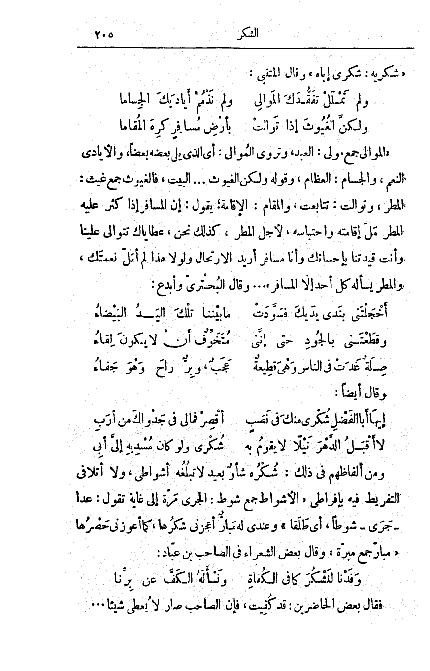 ومن ألفاظهم في ذلك: شُكْرُه شأوٌ بعيدٌ لا تبلغه أشواطي، ولا أتلافى التفريطَ فيه بإفراطي الأشواط جمع شَوْط: الجَرْيُ مَرَّةً إلى غايةٍ تقول: عدا - جرى - شوطاً، أي طَلَقاً وعندي له مَبارٌّ أعجَزني شكرُها، كما أعوزني حصرُها مبارٌّ جمع مبرّة وقال بعض الشعراء في الصاحب بن عباد: