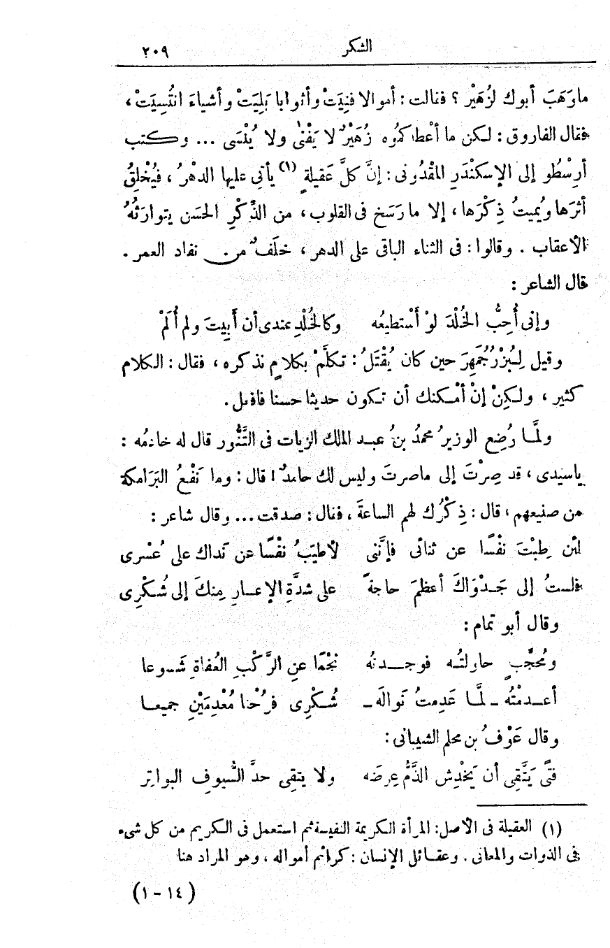 ما وهب أبوك لزُهير؟ فقالت: أموالاً فَنِيَت وأثواباً بَلِيَت وأشياءَ انْتُسِيَت، فقال الفاروق: لكن ما أعطاكموه زهيرٌ لا يفنى ولا يُنسى. . . وكتب أرسطو إلى الإسكندر المقدوني: إنّ كلّ عقيلةٍ يأتي عليها الدَّهرُ، فيُخلق أثرَها ويُميت ذكرَها، إلا ما رسخ في القلوب، من الذكرِ الحسنِ يتوارثه الأعقابُ. وقالوا: في الثناء الباقي على الدهر، خَلَفٌ من نفاد العمر.