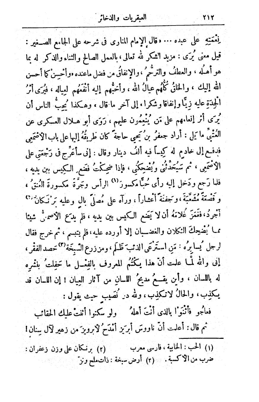 نِعْمَتِه على عبده. . قال الإمام المناوي في شرحه على الجامع الصغير: قيل معنى يُرى: مزيد الشكرِ لله تعالى، بالعمل الصالح والثناء والذكرِ له بما هو أهلُه، والعطفُ والترحُّم، والإنفاقُ من فضل ما عنده وأحسن كما أحسنَ اللهُ إليك، والخلق كلُّهم عِيالُ الله، وأحبُّهم إليه أنفعُهم لِعيالِه، فيُرى أثرُ الجِدَّةِ عليه زيّاً وإنفاقاً وشُكراً إلى آخر ما قال وهكذا يحبُّ الناسُ أن يُرى أثرُ أنعامهم على من يُنعمون عليهم، روى أبو هلال العسكري عن العُتْبيِّ ما يلي: أراد جعفرُ بن يحيى حاجةً كان طريقُه إليها على باب الأصمعيّ فدفعَ إلى خادمٍ له كيساً فيه ألفُ دينار وقال: إنّي سأعَرِّج في رجعتي على الأصمعيّ، ثم سيحدثني ويضحكني، فإذا ضَحِكْتُ فَضَعِ الكيسَ بين يديه، فلمّا رجع ودخلَ إليه رأى حُبّاً مكسورَ الرأسِ وجَرّةً مكسورةَ العُنق، وقَصْعةً مُشَعّبة، وجفنةً أعشاراً، ورآه على مصلًى بالٍ وعليه بَرْنكان أجردُ، فغمز غلامَه أنْ لا يضعَ الكيسَ بين يديه، فلم يدعِ الأصمعيُّ شيئاً مما يضحكُ الثّكلان والغَضْبان إلا أوردَه عليه، فلَمْ يتبسّم، ثمّ خرجَ فقال لرجلٍ يسايرُه: مَن استرعى الذئبَ ظلَم، ومن زرعَ السّبْخةَ حصدَ الفقرَ، إنّي واللهِ لمّا علمت أنَّ هذا يكتم المَعْروفَ بالفعلِ ما حَفِلْتُ بِنَشْره له باللسان، وأين يقعُ مديحُ اللسانِ من آثارِ العِيان! إنّ اللسانَ قد يكذب، والحالُ لا تكذب، ولله درُّ نُصَيْبٍ حيث يقول: