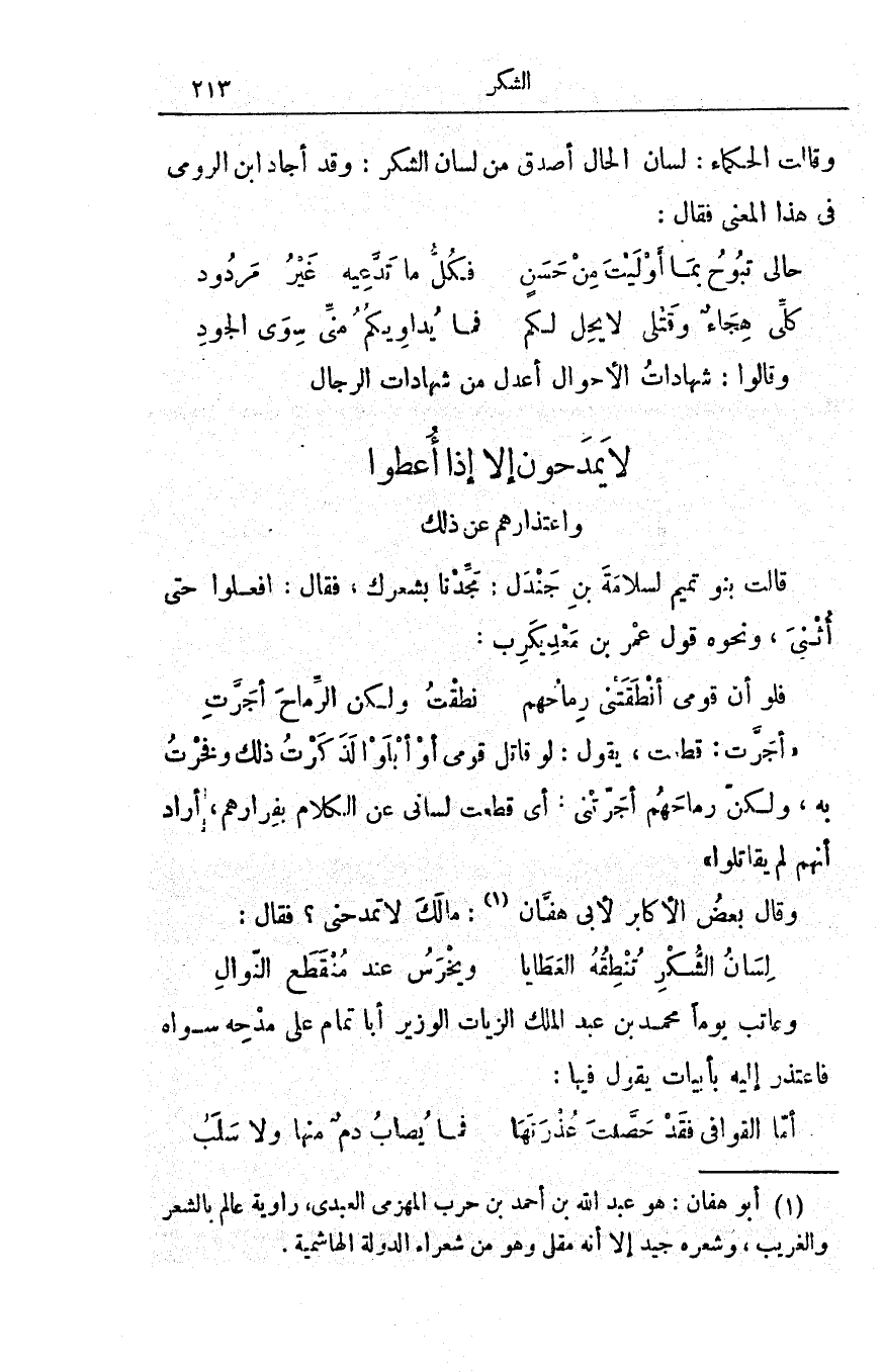 لِسَانُ الشُّكْرِ تُنْطِقُهُ العَطَايا ... ويَخْرَسُ عند مُنْقَطَعِ النّوالِ